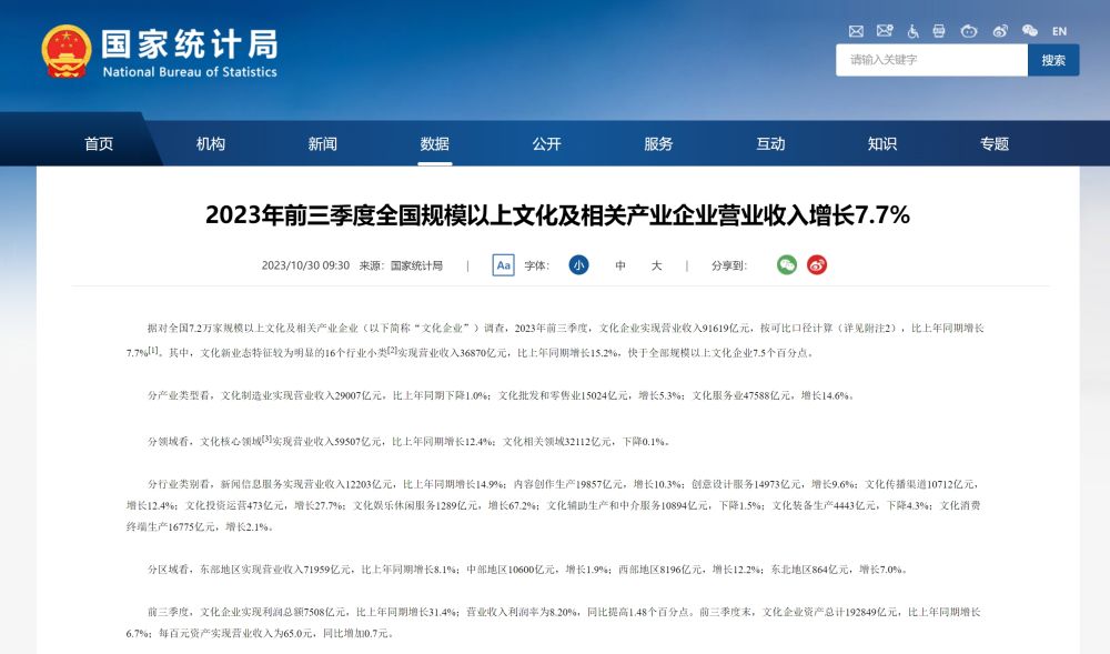 前三季度,文化企业实现利润总额7508亿元,比上年同期增长31.4%;营业收入利润率为8.20%,同比提高1.48个百分点。前三季度末,文化企业资产总计192849亿元,比上年同期增长6.7%;每百元资产实现营业收入为65.0元,同比增加0.7元。