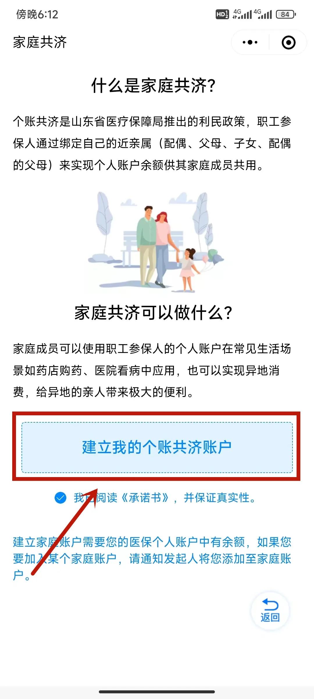 点击“个账共济”,进入“个账共济”页面,阅读说明,选择“我已阅读《承诺书》,并保证真实性”,点击“建立我的个账共济账户”。