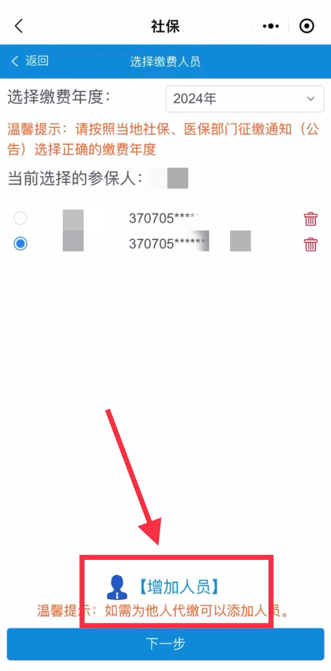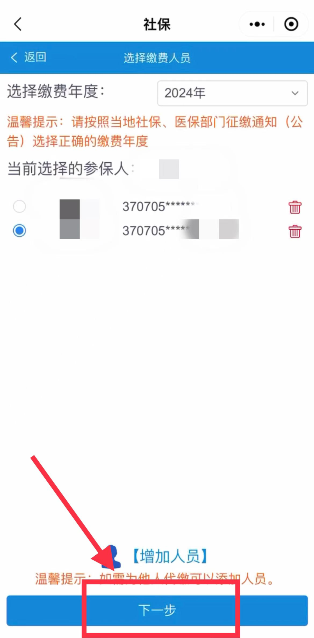 选择缴费年度、需缴费的人员,点击“下一步”。