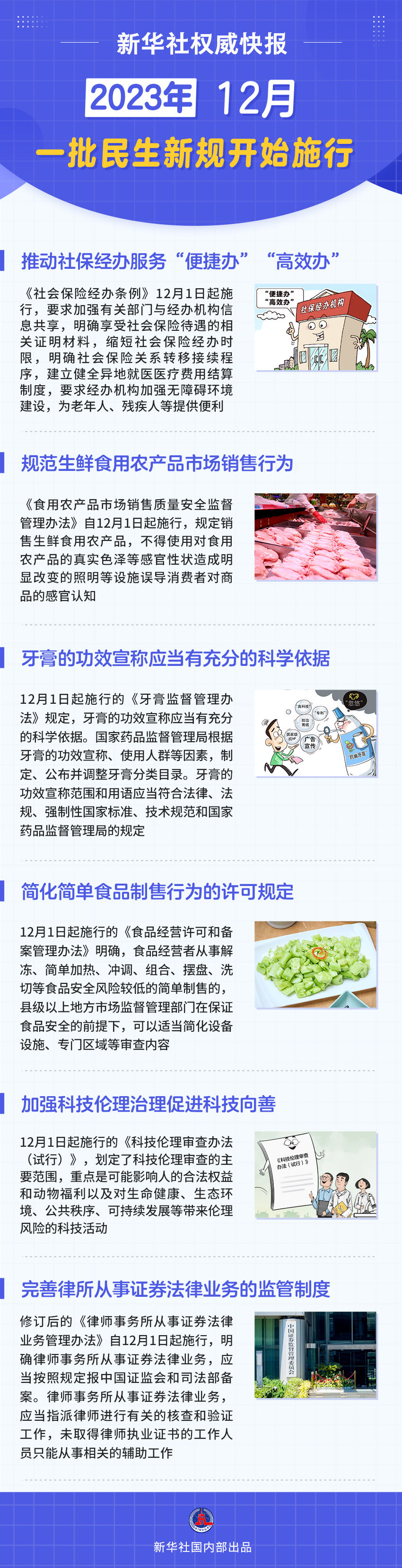 12月一批民生新规开始施行关系社会生活方方面面简化社保经办服务流程推动“便捷办”“高效办”规范生鲜食用农产品市场销售行为增加对销售场所照明等设施的设置和使用要求规范牙膏功效宣称范围和用语整治虚假、夸大宣称功效等问题哪条你最期盼?