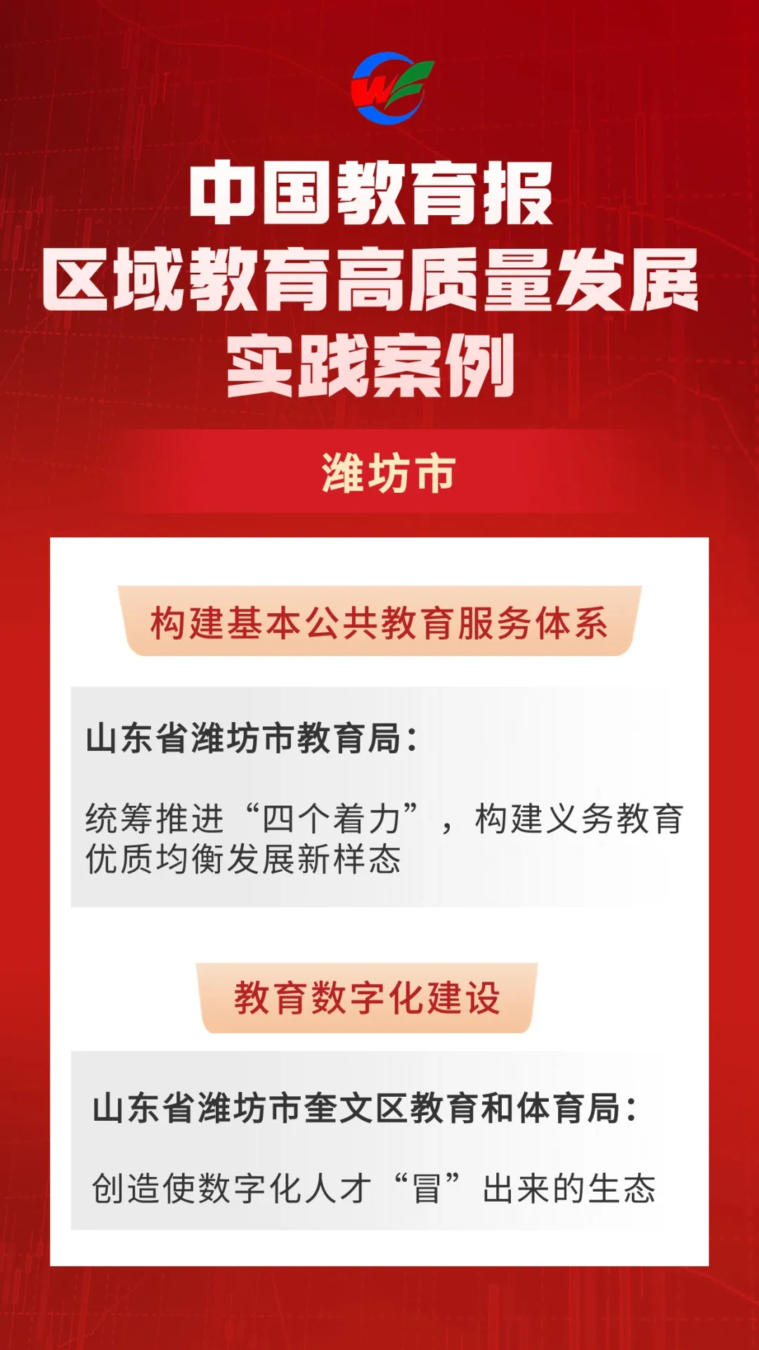 近日,中国教育报联合中国教育发展战略学会区域教育专委会评选出区域教育高质量发展实践案例,其中构建基本公共教育服务体系案例20个,我市《统筹推进“四个着力”,构建义务教育优质均衡发展新样态》入选,全省唯一;教育数字化建设案例20个,我市奎文区《创造使数字化人才“冒”出来的生态》入选,全省2个。下面随小编一起看看吧!