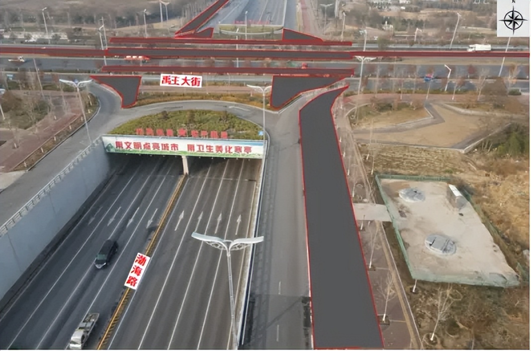 为解决绕行特别是潍坊北站出站绕路问题,实现渤海路与禹王大街交叉口各方向间的交通转换,将对路口进行改造。保留主路下穿方式,地面层进行平交路口改造,具体改造内容包括将部分绿化带、自行车道改造为沥青路面,加宽渤海路进口道辅路宽度设置信号灯、交通监控,重新施划标线、新设标志牌等。
