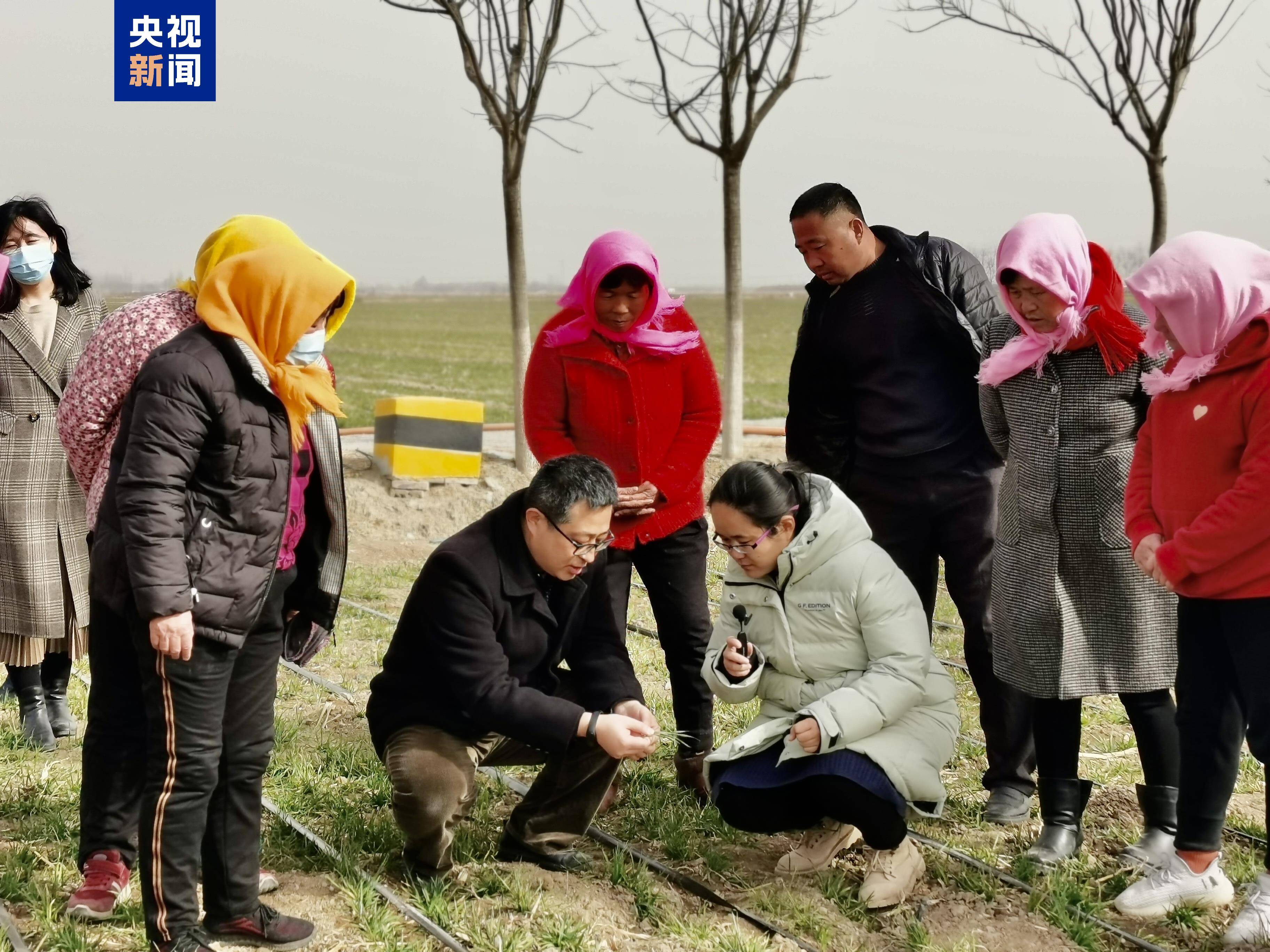 返乡创办家庭农场的高密市大学生刘莉(右四)与农业专家一同向农民传授种植新技术