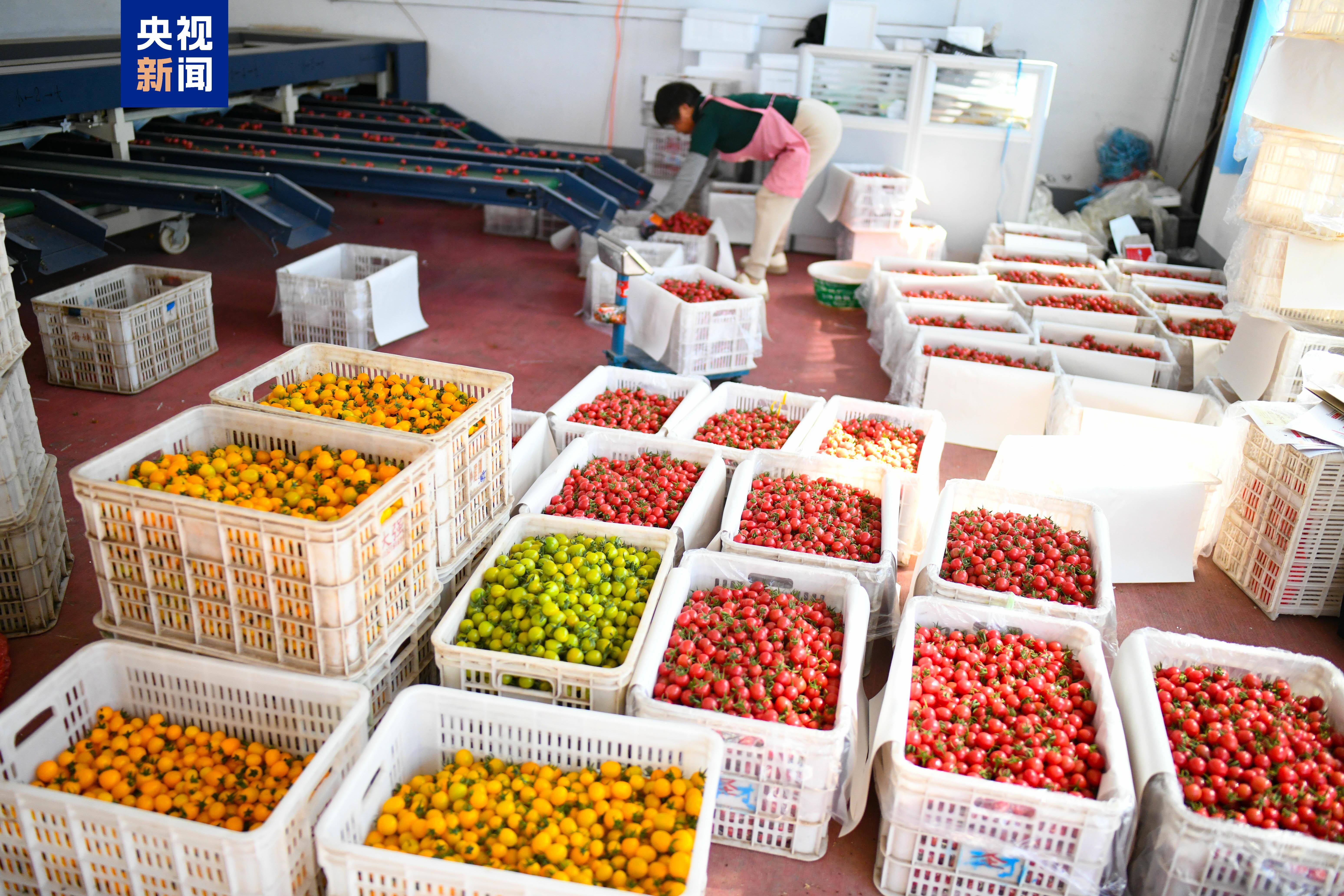 在位于山东潍坊寿光市古城街道前疃村的寿光市旺民蔬菜专业合作社联社内,工作人员正在分拣“七彩小番茄”