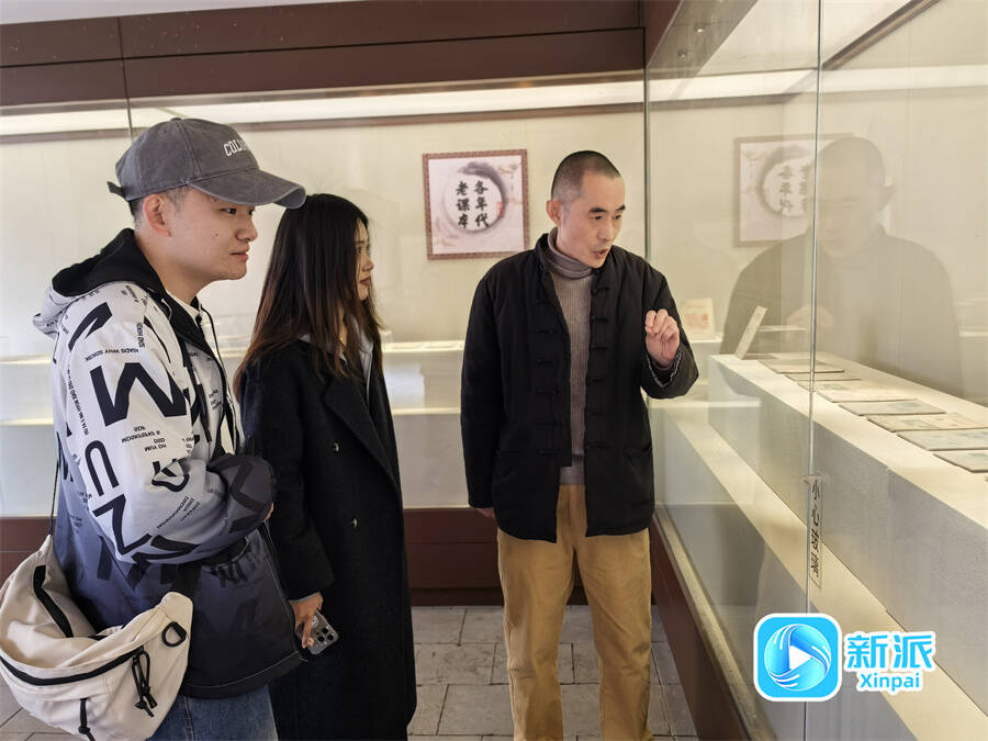 张永彬(右一)为游客介绍自己收藏的老课本。