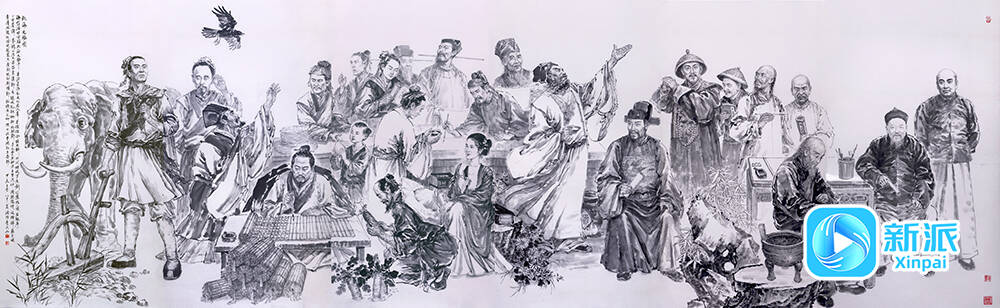 李大山笔墨功底扎实,布局造型熟练。画面中人物神态各不相同,造型相得益彰,形象栩栩如生,风格质朴韵雅。“这几年,我一直在酝酿创意,搜集相关资料,从去年7月开始构思、画草稿,不断调整,研究每位人物的历史资料,历时10个月才创作完成。”李大山介绍。