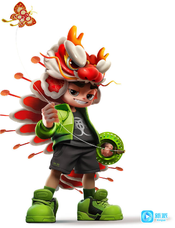 “御风”取自《庄子·逍遥游》“御风而行”,呼应风筝与风共舞的本质。该形象以龙头蜈蚣风筝为原型,龙头象征威严与力量,蜈蚣身躯则寓意团结与延绵不绝的生命力,以英姿飒爽的少年形象,承载着“驾驭风的力量,追逐梦想”的精神内核。“在色彩运用上,选用鲜艳明亮的绿色作为主色调,突出春季的盎然生机与万物复苏的景象。这种色彩选择既展现了潍坊风筝的绚丽多彩,又传递出积极向上的情感。”张腾飞表示。