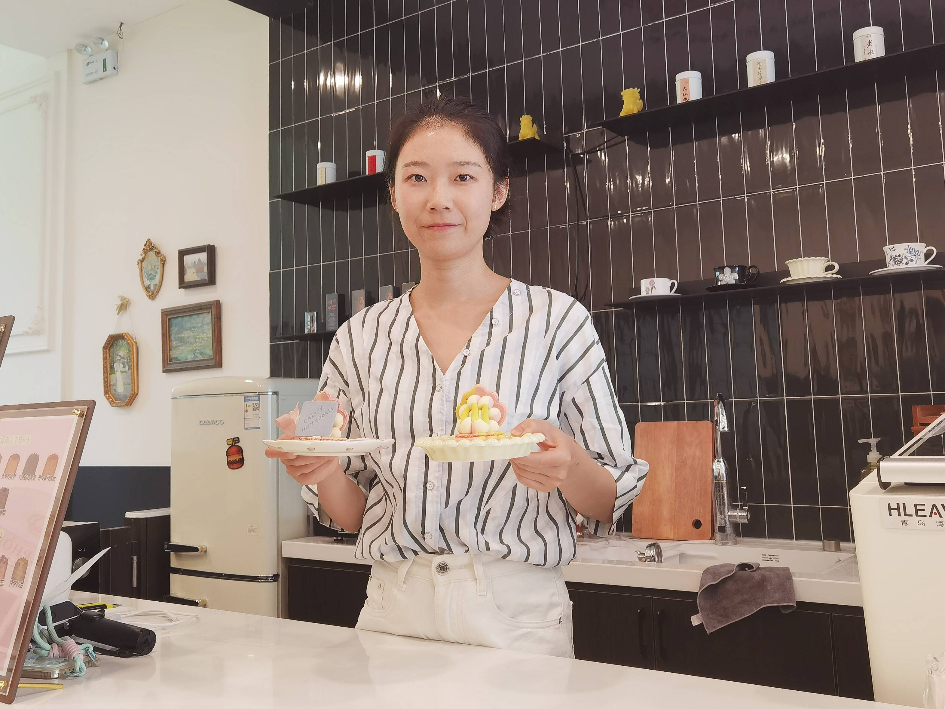 口碑打出去之后,2021年,单子涵在潍坊开了第一家店,起名“Blue27甜品”。购买装饰品,研究装修风格……每一个步骤,每一个细节,她都用心去做。她说:“就想打造一家顾客来了就不想离开的店。”