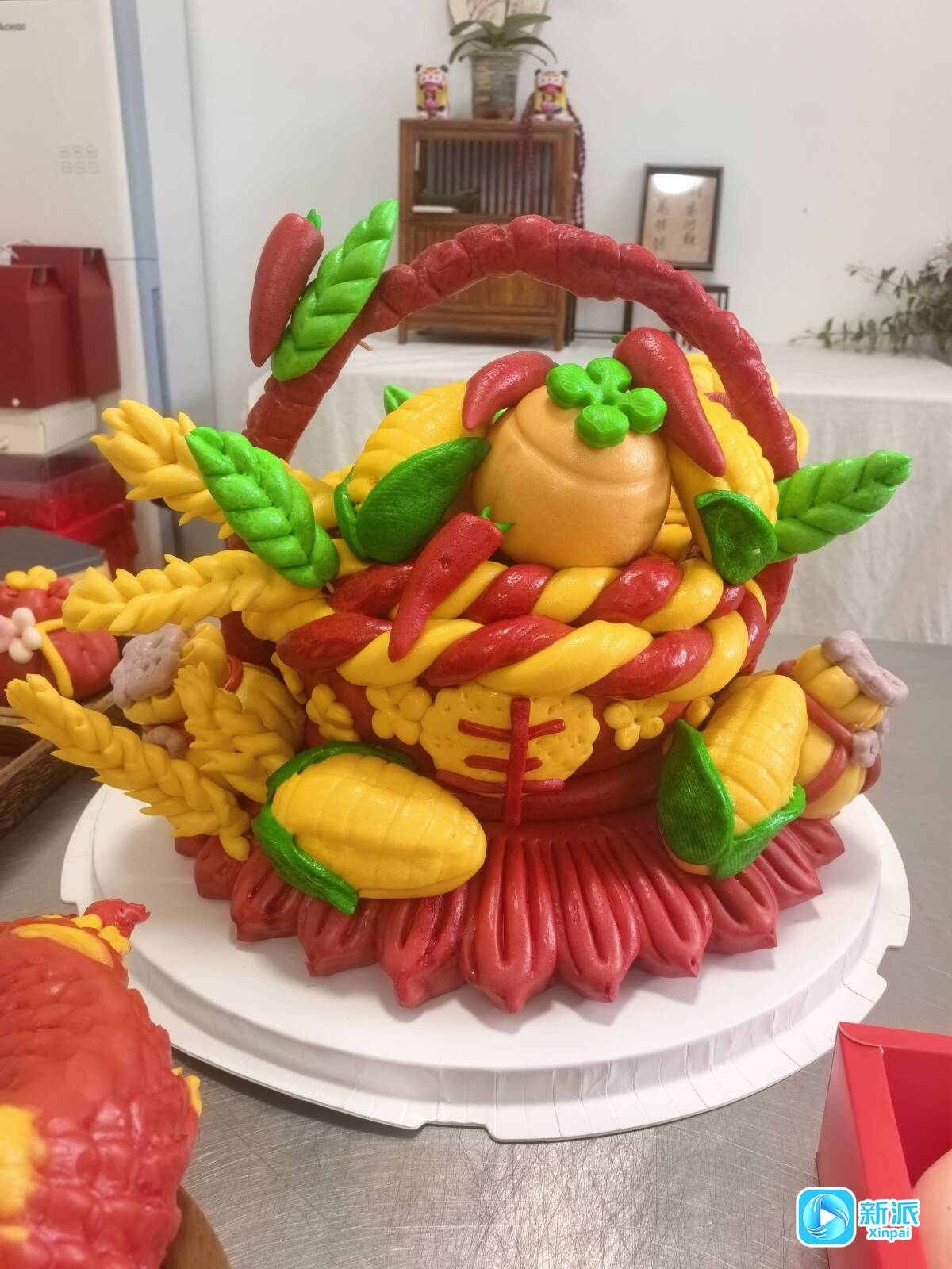 刘娜创作的“盛世中国”作品中,一朵绽放的红牡丹代表祖国繁荣昌盛,周围环绕的向日葵代表心向祖国,颗粒饱满的麦穗则象征人们生活富足,“76”这个数字点明新中国76华诞的主题。“丰收景象”作品则展现了烟火人间的美好。刘娜把田间地头的丰收场景“搬进”花饽饽:麦穗颗粒饱满、玉米纹路清晰、柿子透着红亮、辣椒带着鲜活。每一种作物都栩栩如生,仿佛能让人闻到丰收的香甜,感受到寻常百姓生活的幸福滋味。