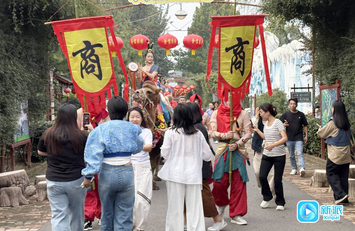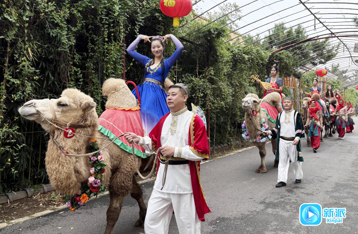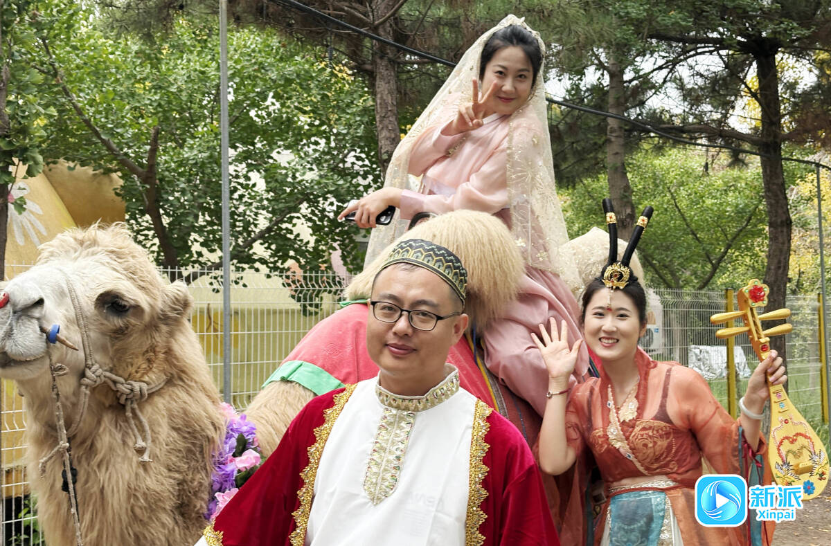 10月1日,潍坊城区金宝乐园内,一场“丝路驼队”活动正在进行,6位女演员装扮成西域女子,骑着骆驼在园内巡游,吸引了众多游客围观。