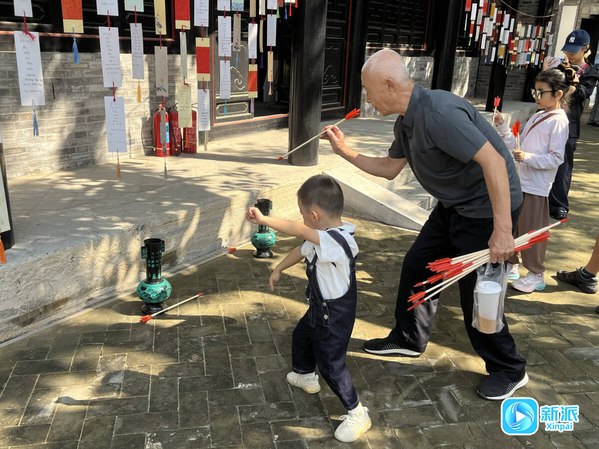 小院天井里,传统相声与古建筑背景奇妙融合,演员即兴加入“潍坊话版”贯口,逗得现场掌声连连;不远处的投壶区,爷孙俩正体验投壶,箭矢入壶时清脆的响声,吸引了不少市民排队体验;最热闹的当属“相亲角”,几十张手写信息签挂满架子。