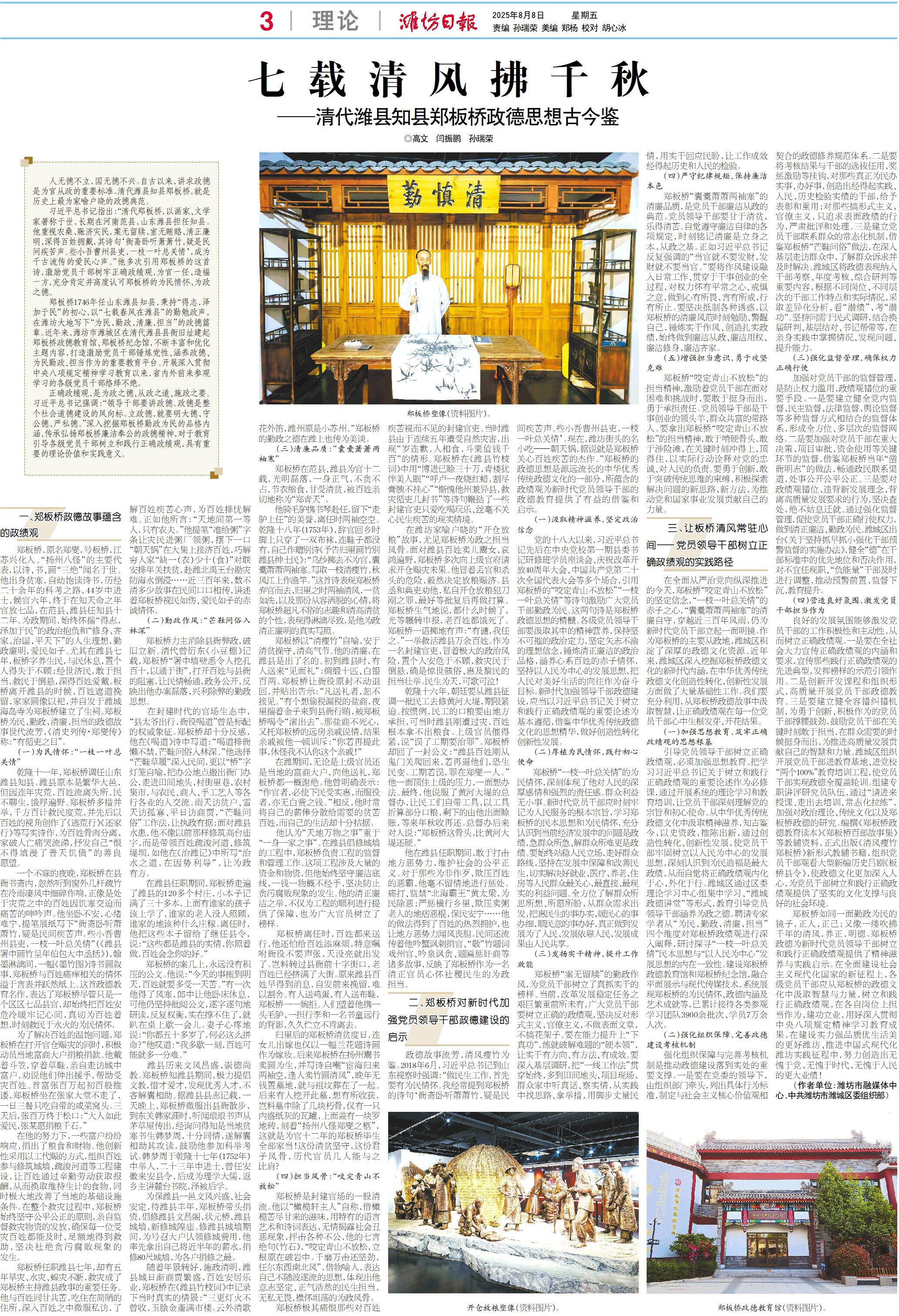 郑板桥1746年任山东潍县知县,秉持“得志,泽加于民”的初心,以“七载春风在潍县”的勤勉政声,在潍坊大地写下“为民、勤政、清廉、担当”的政德篇章。近年来,潍坊市潍城区在清代潍县县衙旧址建起郑板桥政德教育馆、郑板桥纪念馆,不断丰富和优化主题内容,打造激励党员干部锤炼党性、涵养政德、为民勤政、担当作为的重要教育平台。开展深入贯彻中央八项规定精神学习教育以来,省内外前来参观学习的各级党员干部络绎不绝。