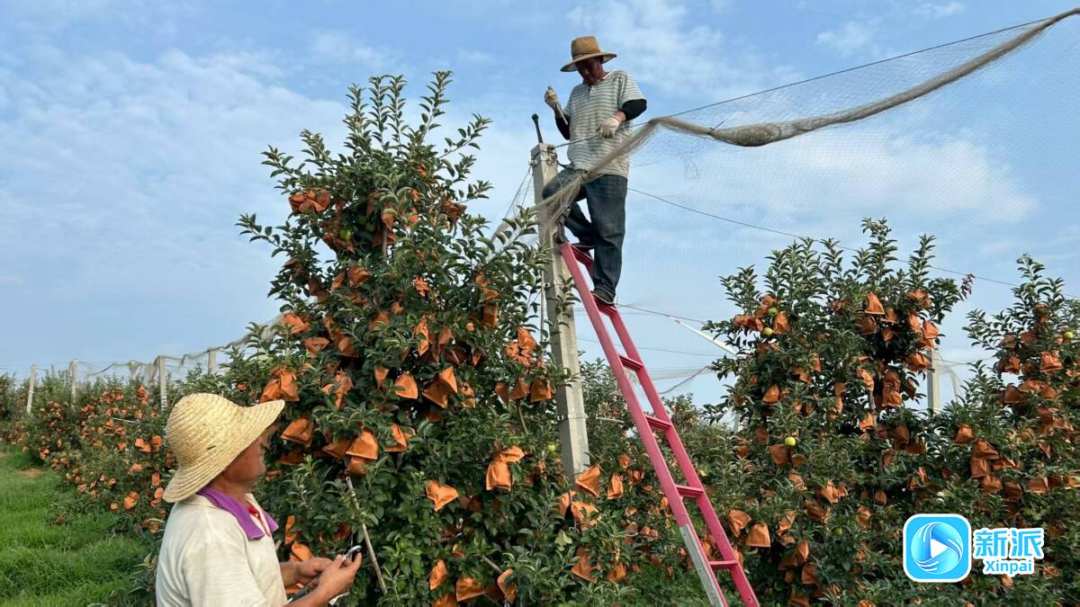 果农套袋拉网保护苹果。