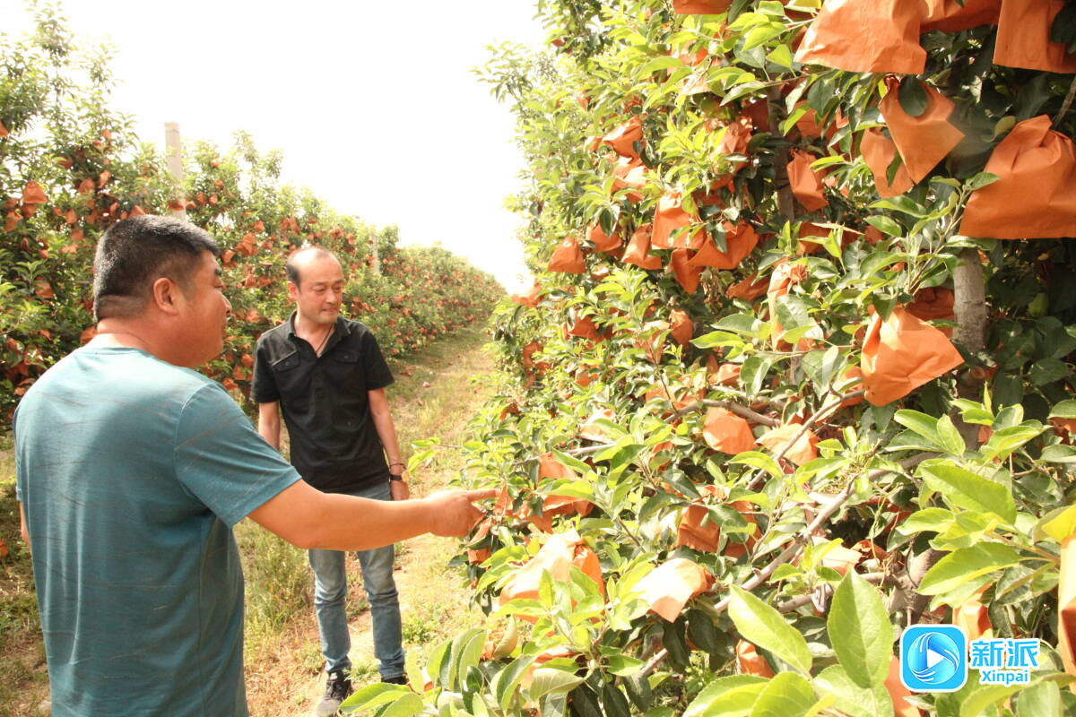 丁昱文(右)查看苹果长势。