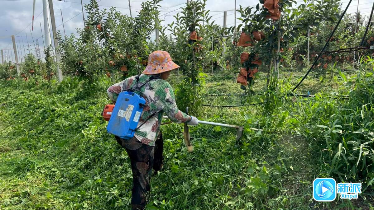8月4日,记者在桃园生态经济发展区诸城坤和农业苹果种植基地看到,成方连片的果树生长旺盛,一个个苹果套着袋子挂在树上,有的果农正在用机械割草,有的果农正在操作水肥一体化浇水施肥。