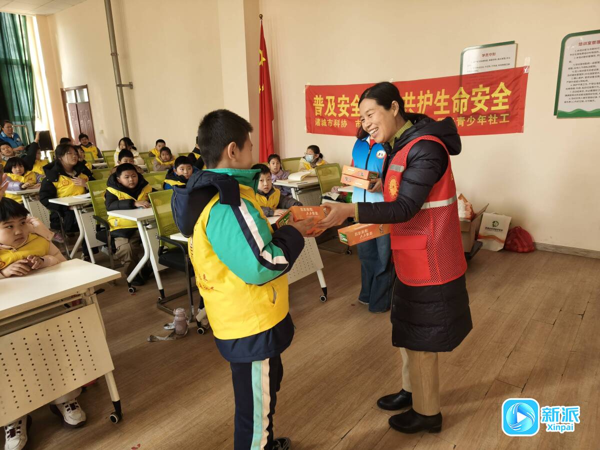 2月23日,诸城市科协联合七色阳光青少年社工组织开展的青少年急救知识培训活动现场,志愿者为孩子们发放科普礼包。