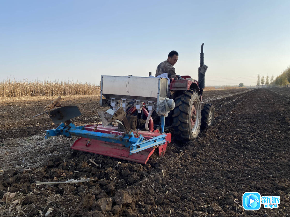 “天气越来越冷,我们与时间赛跑、抢抓农时,保证播种质量和播种进度。这块地已经犁过晾晒几天,土也松散了,得赶紧趁墒情好把小麦种下去。”在前唐店子村的农田里,农户正忙着往播种机里添加麦种。