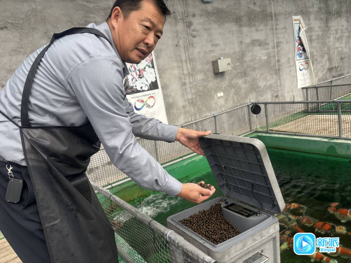 新派讯 11月10日,在潍坊临朐县冶源街道河南村的聚祺养鲤场,负责人李亮俯身池边,一边喂食,一边和鱼儿亲昵互动。李亮是一位酷爱养锦鲤的人,培育了一批又一批精品锦鲤,其中一条曾以两万多元的价格拍出。他的养殖场常年保有“红白”“大正”“昭和”“白写”等十几个优质品种,年繁育优质锦鲤5000尾,销往全国各地。
