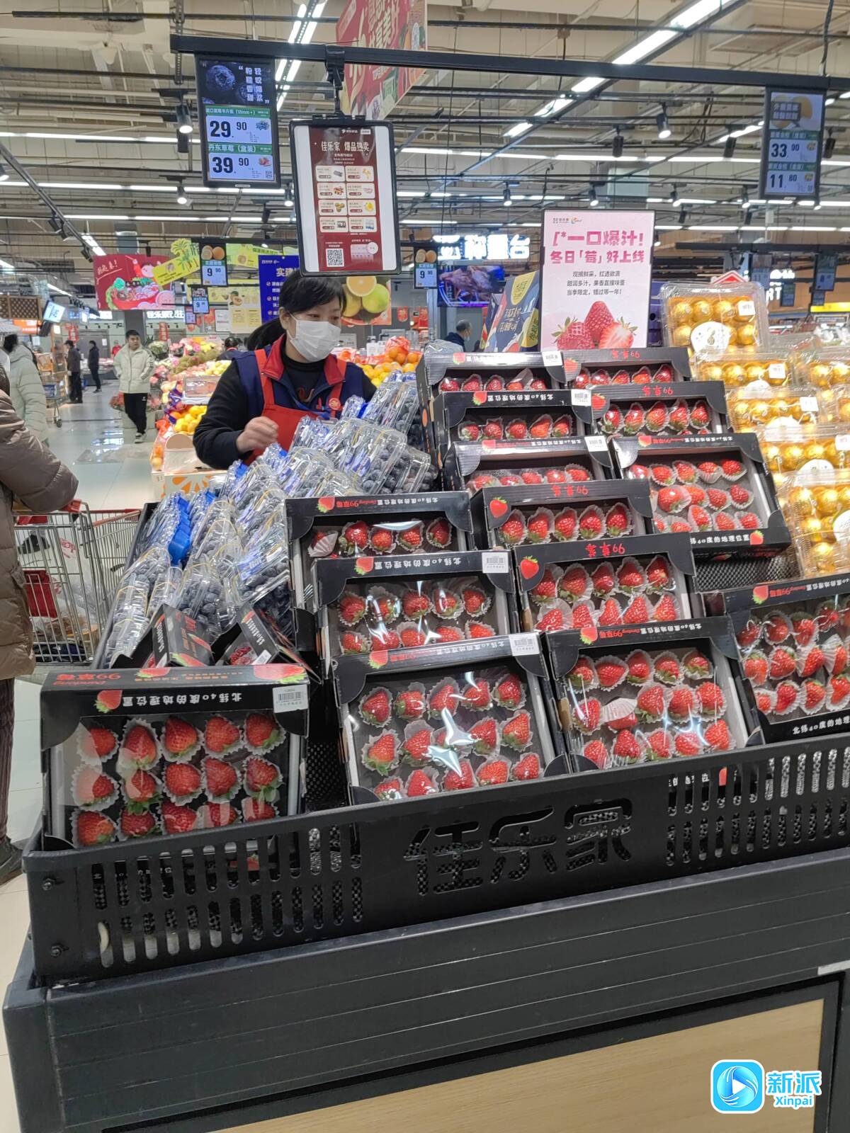 在佳乐家超市新华店,货架上摆满各种各样的水果,苹果、葡萄、桔子、梨等应有尽有。“一口爆汁!冬日‘莓’好上线!”货架上方的草莓海报格外显眼,一盒盒包装精美、色泽鲜艳的草莓占据货架“C位”。200克盒装的丹东草莓每盒15颗,售价39.90元。“这是本季的头茬草莓,品质非常好。”超市工作人员说。