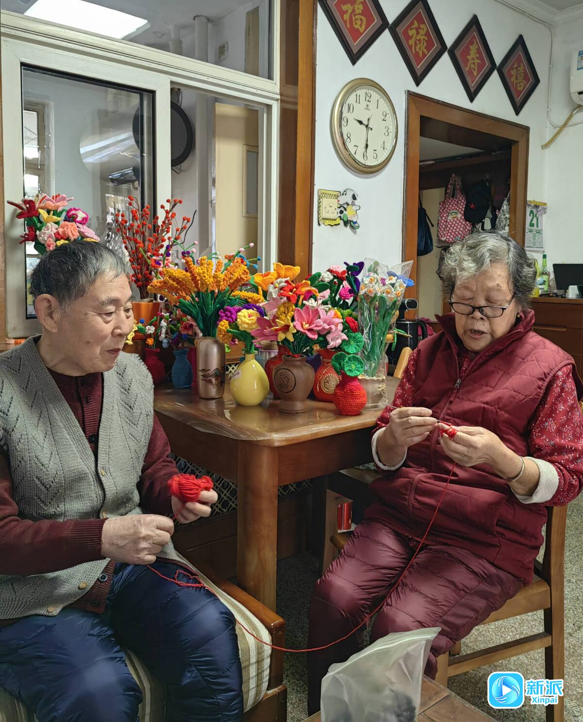 包子包好后,老两口也没闲着,张茂生耐心地缠毛线,秦瑞琴拿起钩针钩织一朵红色的“玫瑰花”。记者发现,他们家中的桌子上、窗台上,摆满了用毛线钩织成的五颜六色的花朵,还有一瓶瓶“麦穗”等毛线工艺品,颜色亮丽又非常逼真,让人爱不释手。“这些年,我钩织了很多这种工艺品,还有小孩子的毛线玩具,我和老伴大都送人了。”秦瑞琴说着,又拿出来她钩织的一顶顶颜色、造型各异的帽子。“有人来我们家串门,我们从来不让他们空手回去,都会送上自己手工制作的吃的、用的,大家都喜欢,我们俩也开心。”张茂生开心地说。