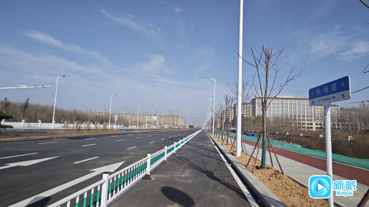 记者站在民航街与机场路交叉口向南眺望,一条崭新的双向八车道柏油路在冬日阳光下熠熠生辉,笔直宽阔的路面如同一条黑色缎带向前延伸。新建设的机场路按照“两块板”模式改造,中间绿化带内,造型松挺拔俊秀,冬青郁郁葱葱,高低错落的植被不仅形成了优美的道路景观,更实现了对向车流的有效分隔。更令人眼前一亮的是,道路两侧不仅用护栏隔离出专门的非机动车道,人行道更采用透水彩色铺装,既醒目美观,又践行了海绵城市建设理念。每一个细节都彰显着城市建设者的匠心独运。