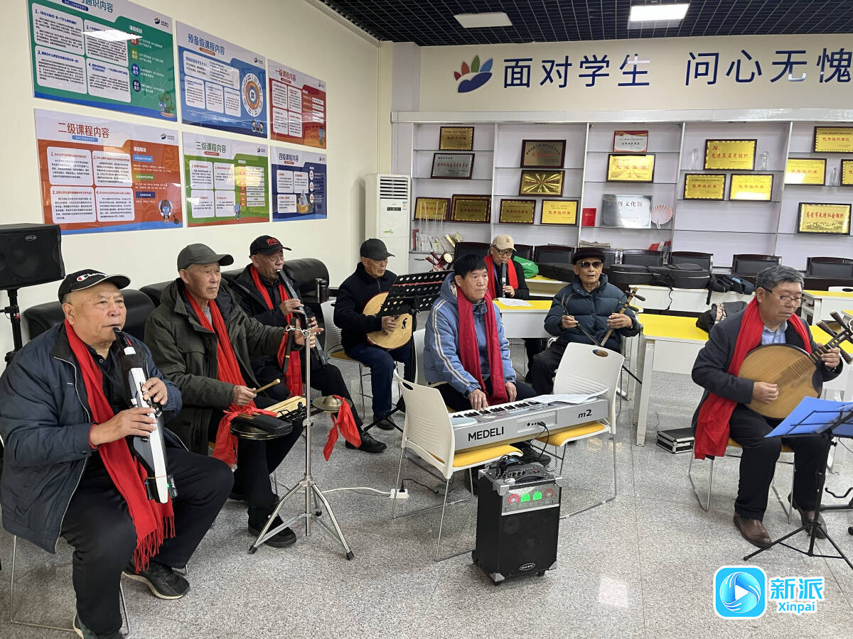 12月8日,高密市文化馆三楼排练厅里,近30名老年音乐爱好者,专注地排练歌曲《人人都说高密好》。曹砚生和王建亭是排练活动的领头人,也是歌曲的词曲作者。他们一个在乐队中演奏乐器,一个手持乐谱敲打着拍子。当最后一个音符落下,曹砚生与王建亭相视一笑,为大家鼓掌以示鼓励。