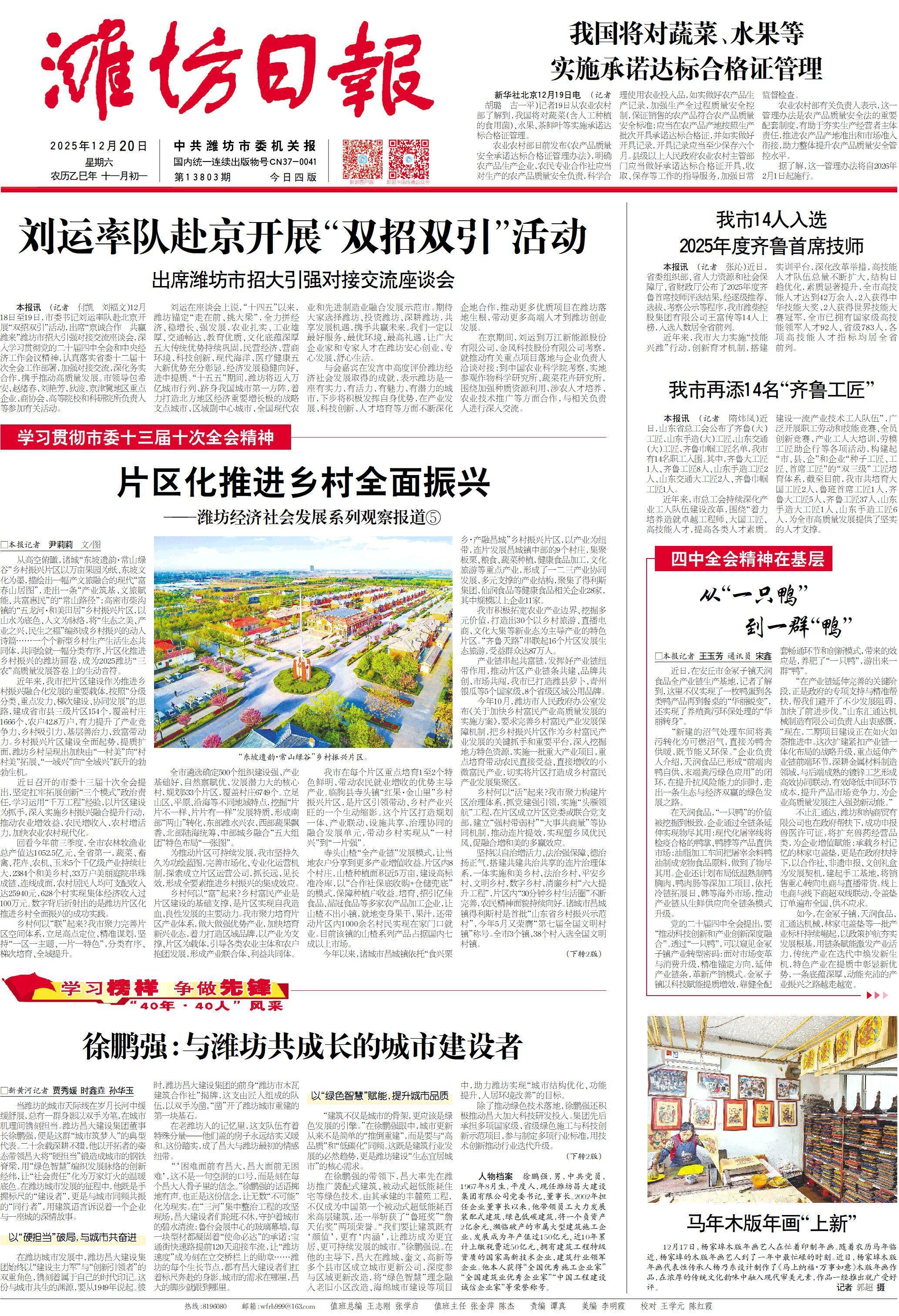 编者按 我市前期评选出的“40年·40人”杰出人物,涵盖经济社会发展的各领域各行业,是潍坊人民团结奋斗、实干担当的杰出代表。在冲刺收官“十四五”、谋篇布局“十五五”的关键节点,为全力营造学先模、鼓干劲的浓厚社会氛围,汇聚“走在前、挑大梁”的磅礴力量,鼓舞全市上下坚持以新发展理念为引领,砥砺奋进、攻坚克难,为加快建设更好潍坊书写精彩答卷,开设“学习榜样 争做先锋 ‘40年·40人’风采”栏目。