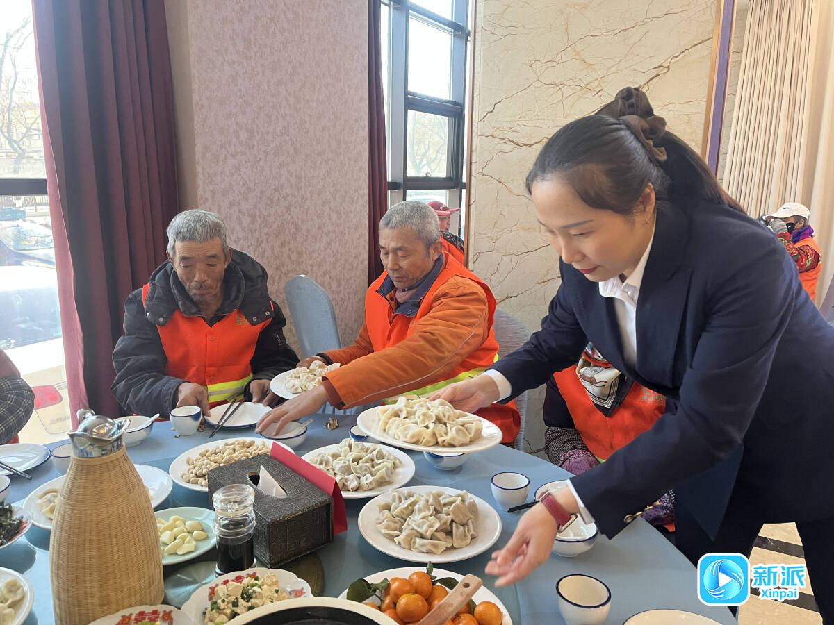当天上午11时30分许,结束了一上午工作的环卫工人陆续走进布置得温馨雅致的酒店大厅。一张张圆桌上,早已整齐摆好新鲜的水果、精致的小菜和温热的饺子汤。后厨里,工作人员正忙碌地煮着饺子,热气蒸腾间,满是家的味道。