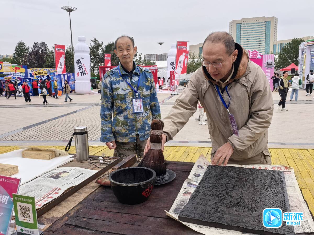 山东艺术学院年画雕版博物馆馆长吴军(右)正在为跑友和市民印刷年画。