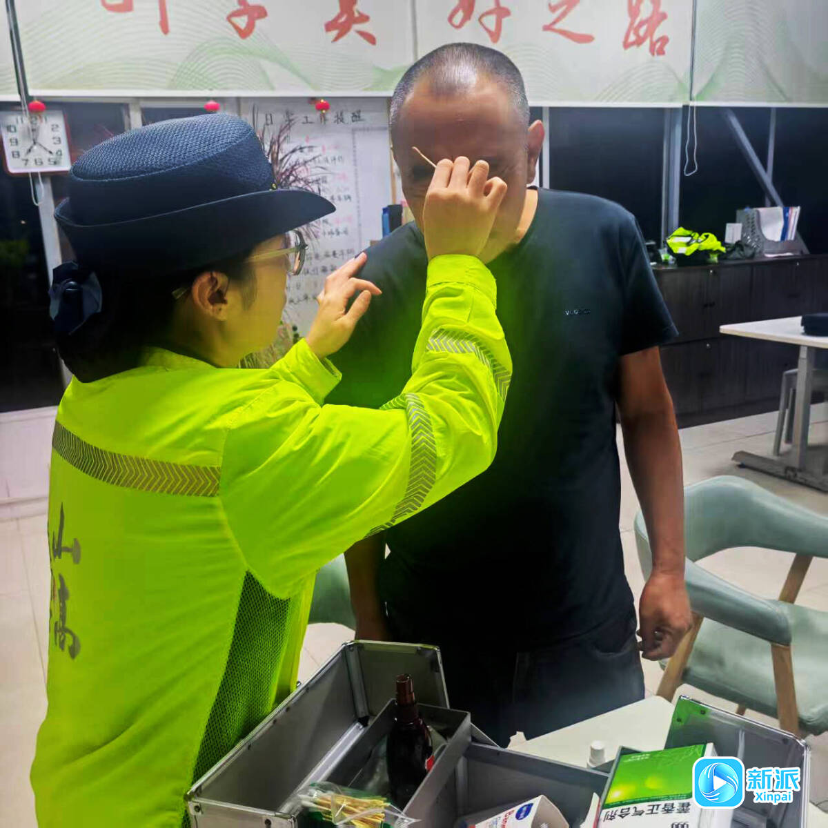 9月17日,夜色中的青州南收费站广场格外静谧,一位货车司机在下车检查货物固定情况时,不慎撞伤额头。正在值守的志愿者见状,立即快步上前查看伤情,随后引导他来到服务站,迅速取出医药箱为司机处理伤口,动作娴熟又轻柔。处理完伤口,司机握着志愿者的手连连道谢。