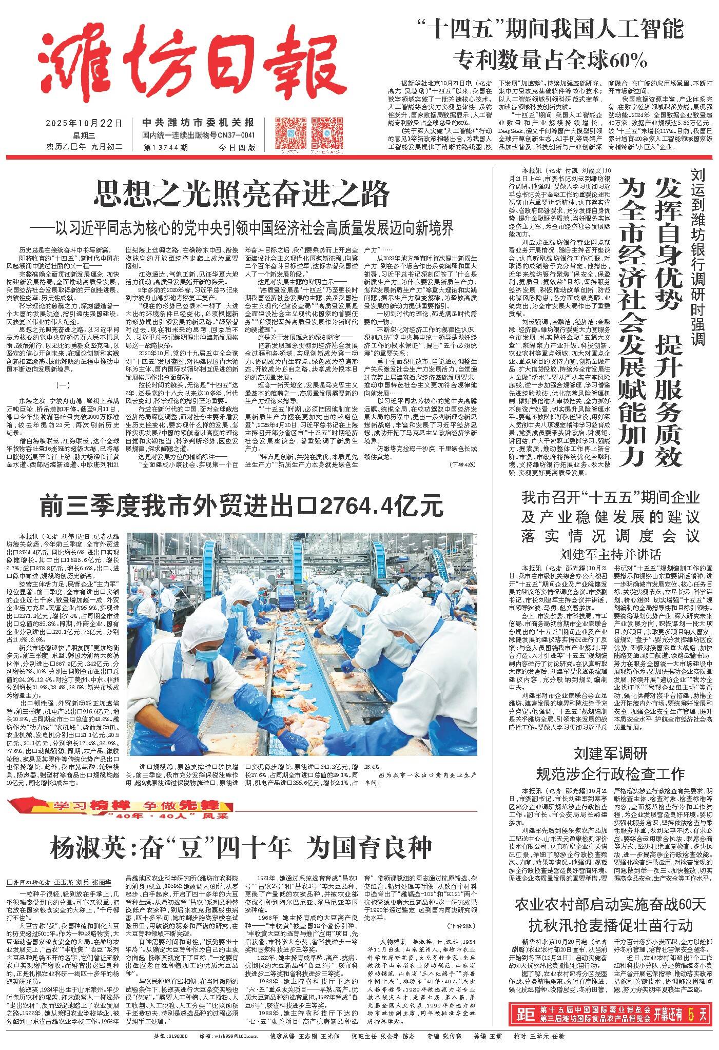 编者按 我市前期评选出的“40年·40人”杰出人物,涵盖经济社会发展的各领域各行业,是潍坊人民团结奋斗、实干担当的杰出代表。在冲刺收官“十四五”、谋篇布局“十五五”的关键节点,为全力营造学先模、鼓干劲的浓厚社会氛围,汇聚“走在前、挑大梁”的磅礴力量,鼓舞全市上下坚持以新发展理念为引领,砥砺奋进、攻坚克难,为加快建设更好潍坊书写精彩答卷,开设“学习榜样 争做先锋 ‘40年·40人’风采”栏目。