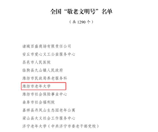 10月29日,全国老龄工作委员会办公室公布全国“敬老文明号”和全国“敬老爱老助老模范人物”名单,授予1290个集体全国“敬老文明号”称号,授予1990名个人全国“敬老爱老助老模范人物”称号。其中,潍坊市老年大学被授予全国“敬老文明号”称号。