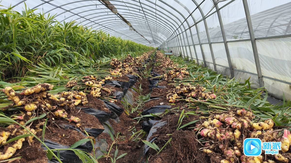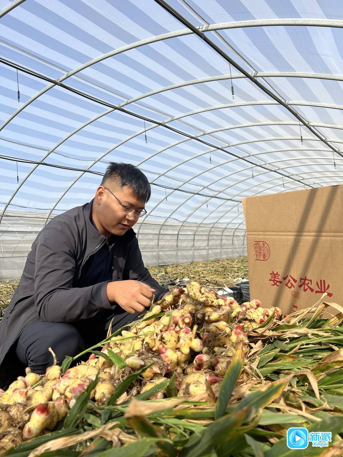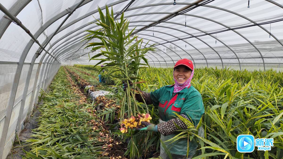 新派讯 挖姜、剪杆、装箱……重阳节前后,位于潍坊昌乐县的山东姜公农业科技有限公司基质栽培有机生姜种植园区,张美红与伙伴们在生姜种植大棚里一忙就是一天,挖出了一片片形状犹如山峦的金黄鲜亮的姜块,虽然汗水湿透了围巾,但干劲十足。