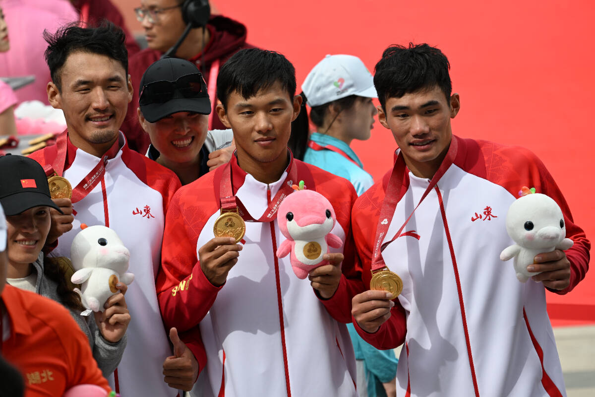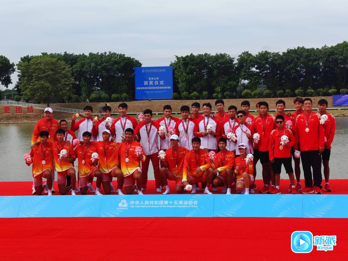 第十五届全运会赛艇男子八人单桨有舵手决赛结束,山东队勇夺金牌。(后排左六为邵志强)