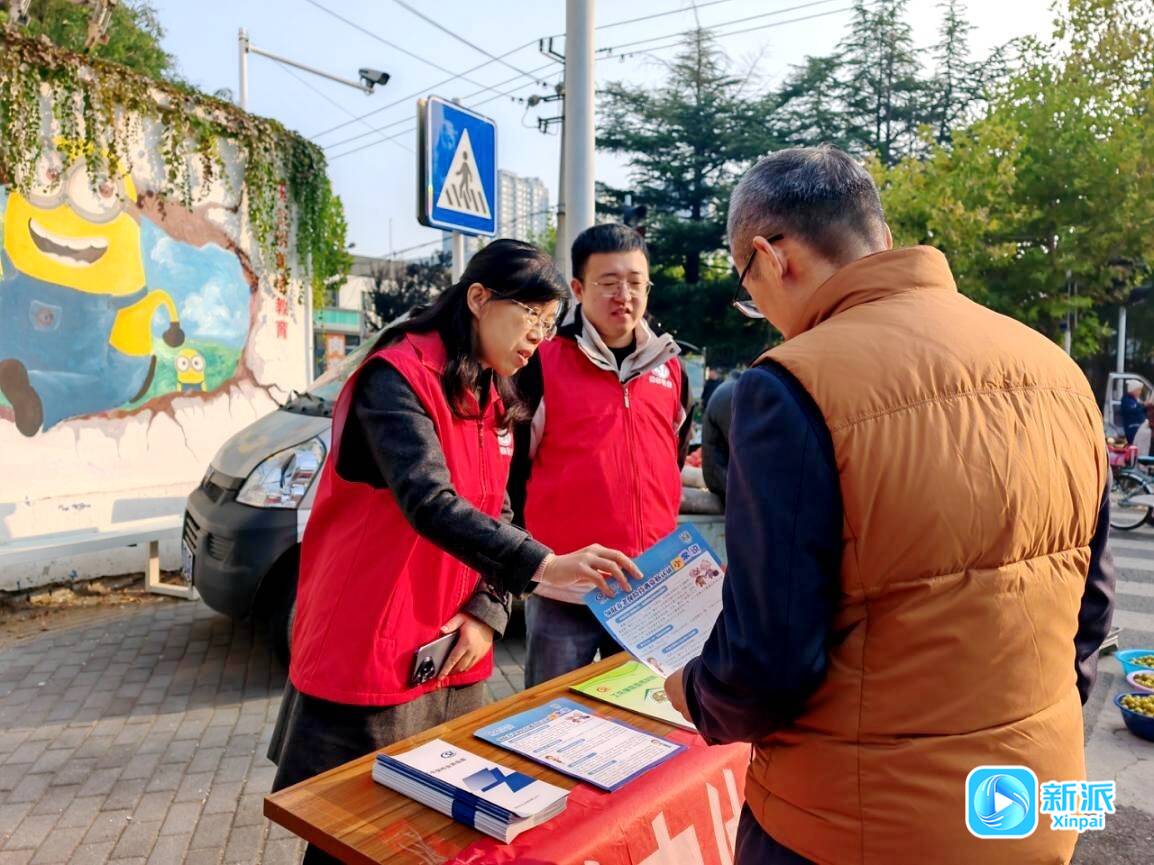 工作人员走进早市,开展社保政策宣传活动。