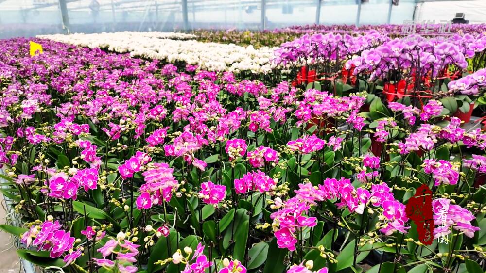 春节临近,在山东省潍坊市临朐县一花卉苗木产业园内,上万株蝴蝶兰正绚丽盛放,整齐的栽培架上,各色花朵汇成一片斑斓的海洋。
