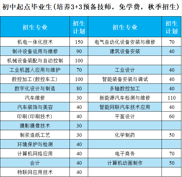 初中生毕业生报考预备技师,采取3+3培养模式,学生完成中级技工阶段学习,直修预备技师。
