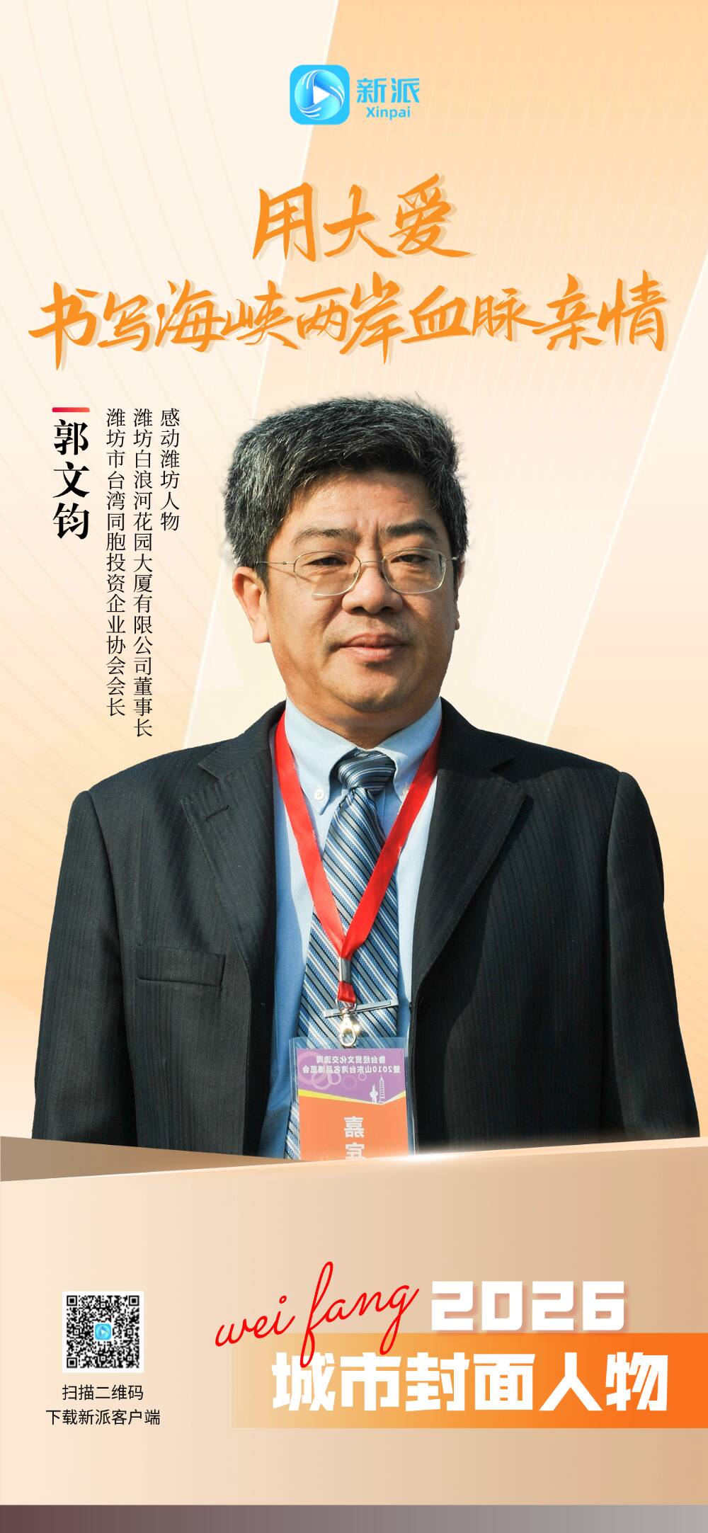 《2026城市封面人物》栏目,聚焦身边的感动,诠释潍坊城市精神,展现新时代潍坊人风采。通过开屏展示、平台热推,讲好潍坊故事,传播潍坊声音,让更多人看见“身边的榜样”,汇聚起推动更好潍坊建设的磅礴力量。活动由中共潍坊市委宣传部、中共潍坊市委社会工作部、潍坊市文明办主办,潍坊市融媒体中心承办。本期封面人物是潍坊市台湾同胞投资企业协会会长、潍坊白浪河花园大厦有限公司董事长郭文钧。