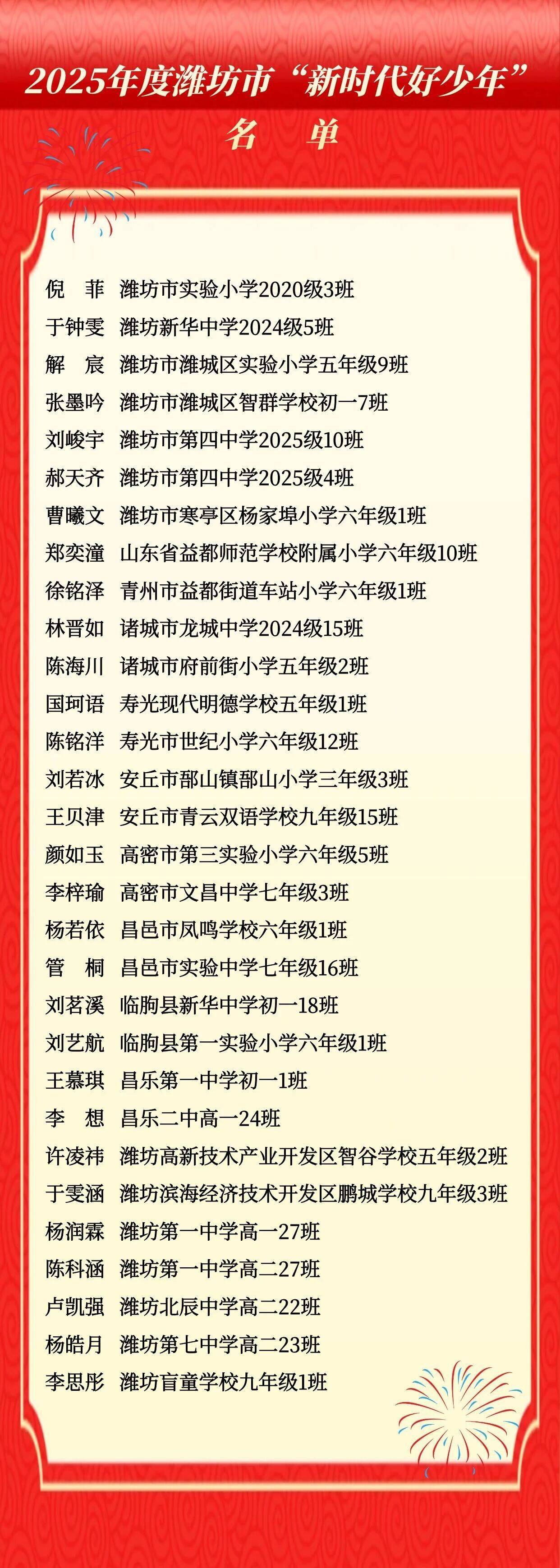 根据工作安排,市文明办、市关工委、团市委、市妇联、市教育局联合开展了2025年度潍坊市“新时代好少年”宣传选树活动。经宣传发动、组织推荐、评审会综合评定,共评选出30名新时代好少年。名单如下:来源:文明潍坊编辑:陈晓芳 孙锦一审:姜健 李敬友二审:孙瑞永三审:王桂林