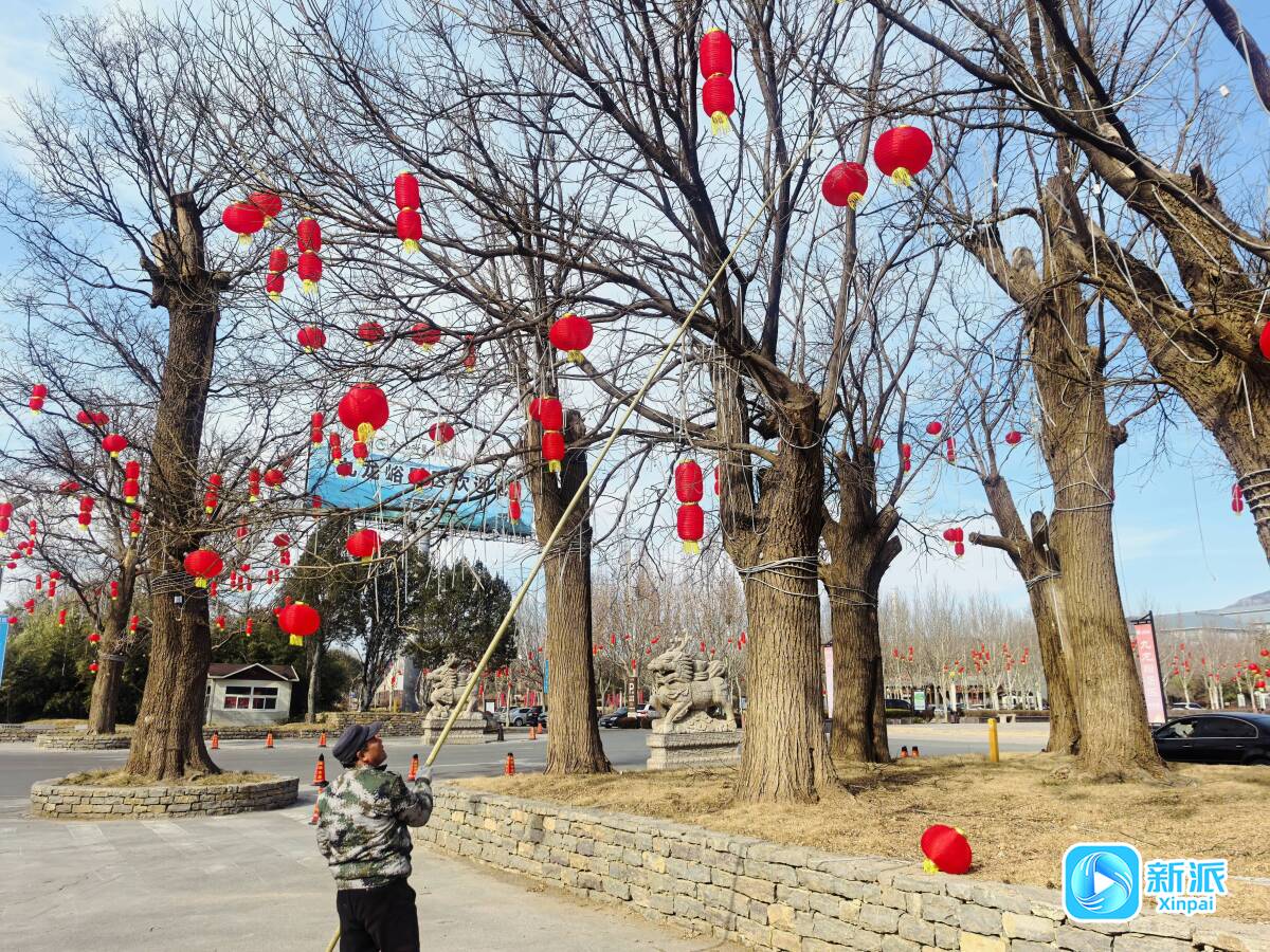 青州九龙峪景区,工作人员正在悬挂红灯笼,增添喜庆氛围。