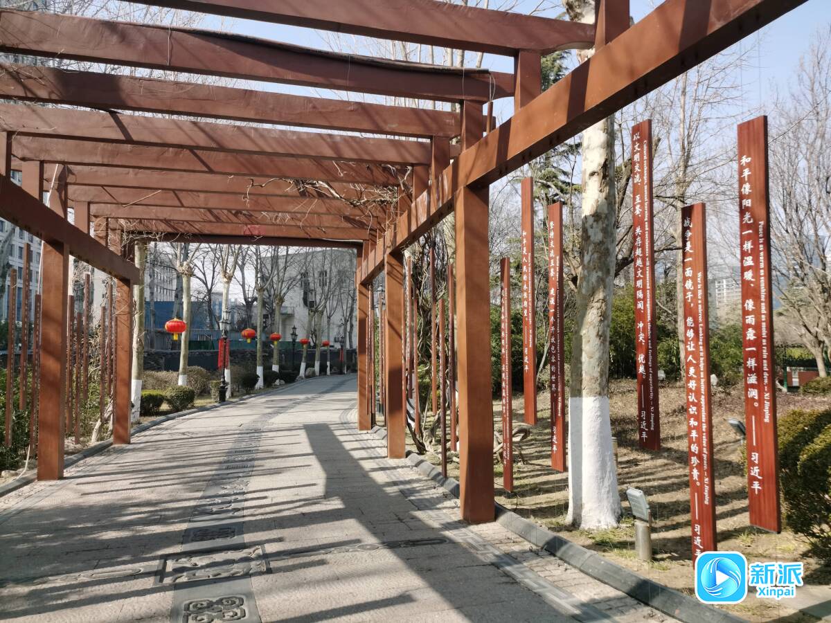 胜利东街虞河景区入口处,国际和平主题公园的标识在阳光的照射下熠熠生辉。步入公园,主干道两侧的树木上挂着灯笼,节日氛围非常浓厚。路两侧的宣传栏以宣传和平内容为主,将和平元素巧妙融入自然景观。
