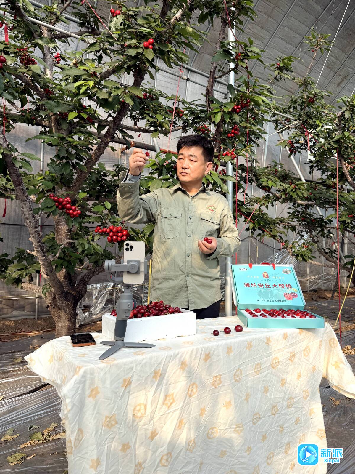 景芝红樱谷大樱桃种植基地负责人刘东辉在直播卖樱桃。