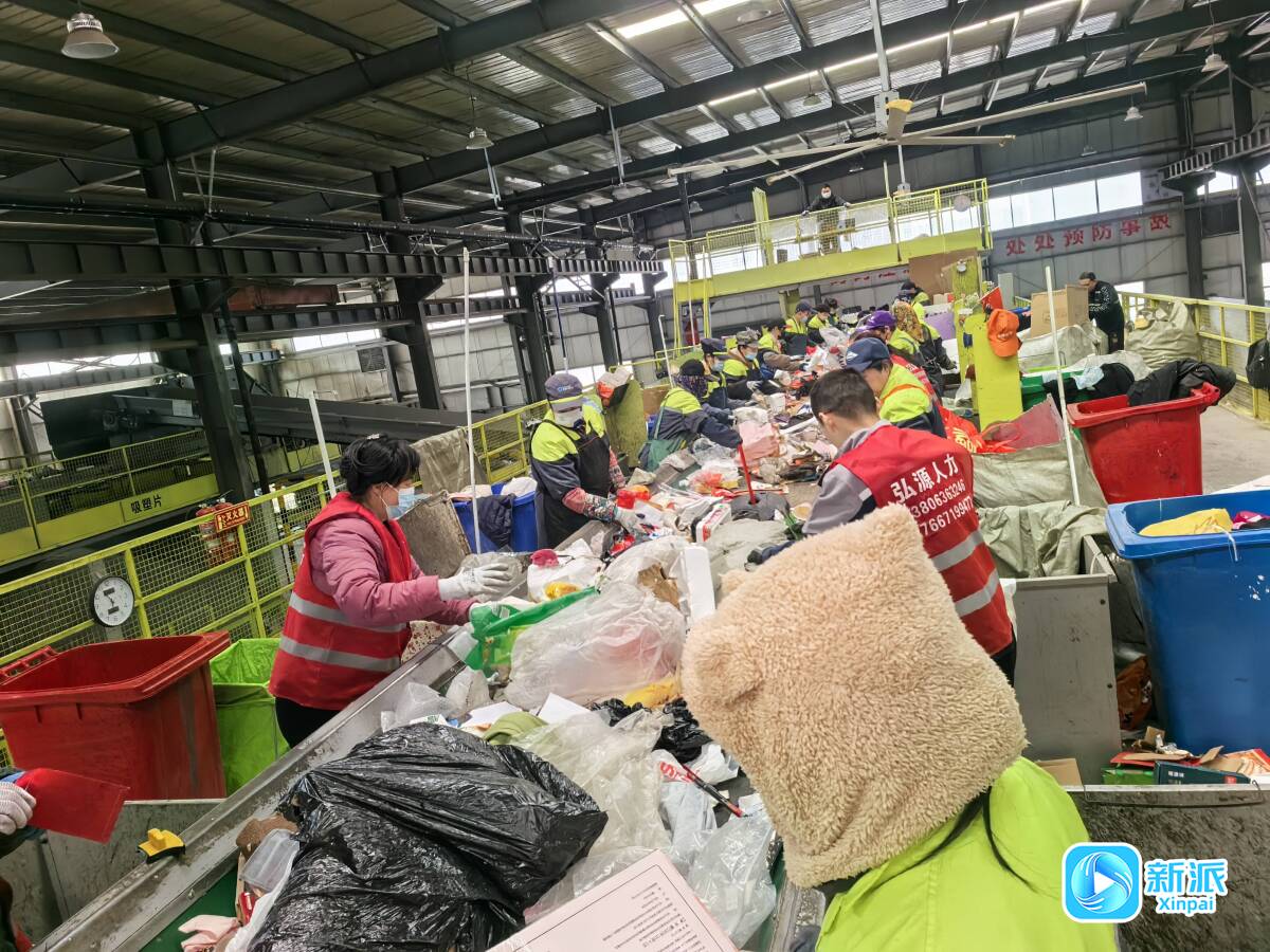 “爱回收·爱分类”潍坊分拣中心内,分拣人员正在对可回收物进行分拣。