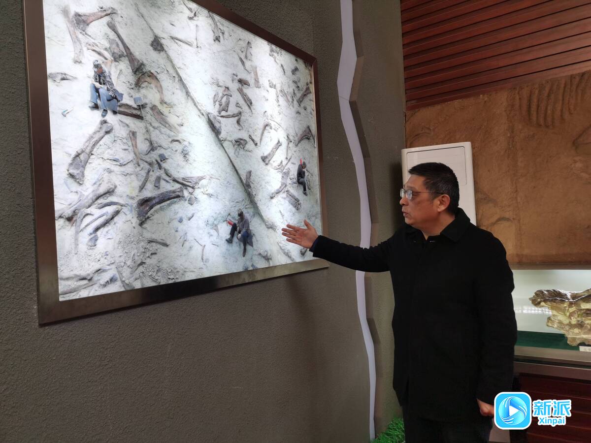 闫团祥介绍自己在诸城第三次大规模恐龙化石发掘现场拍摄的照片。