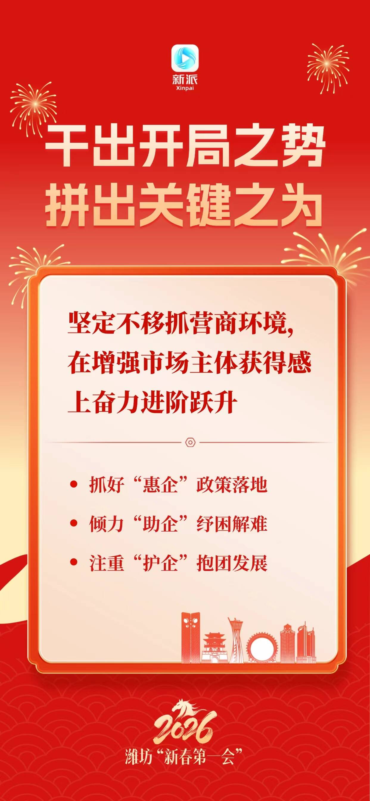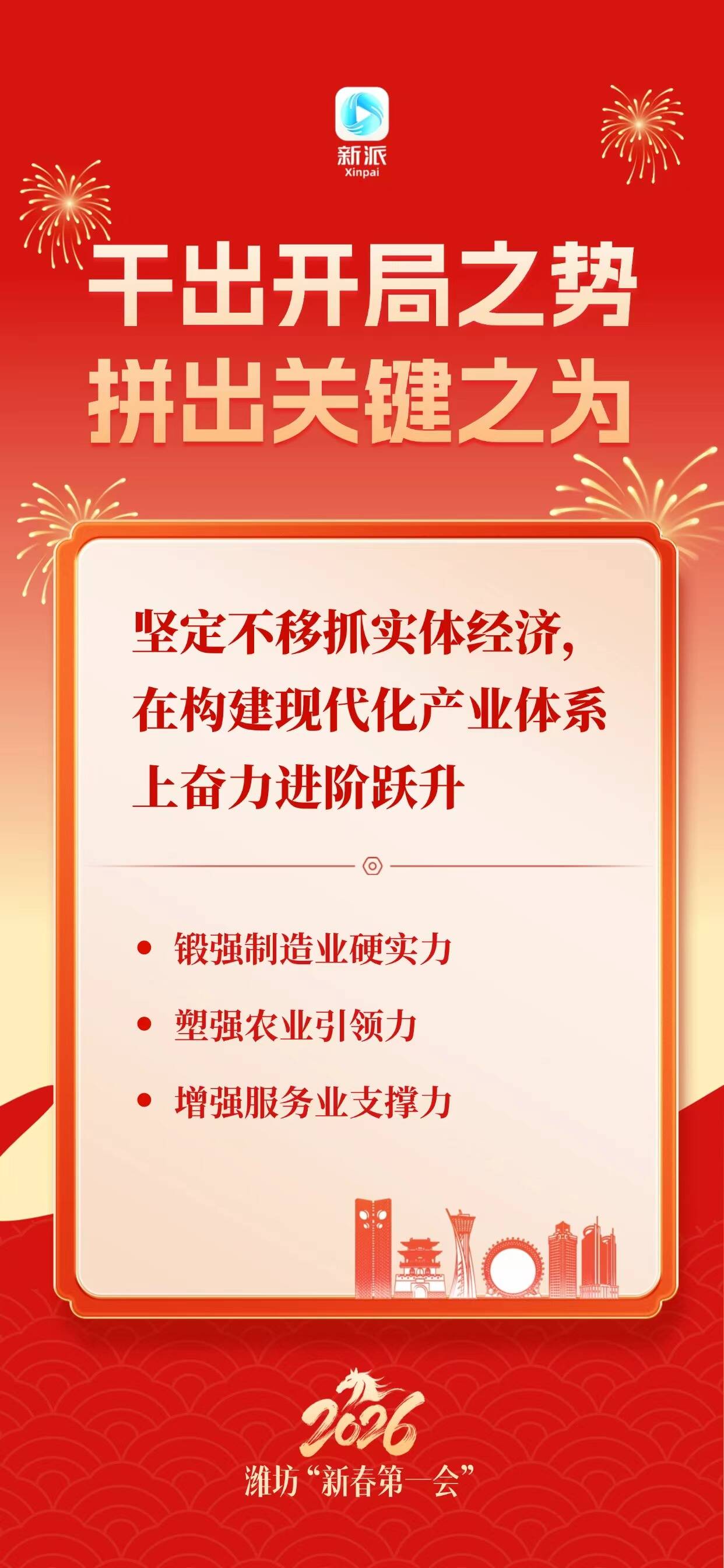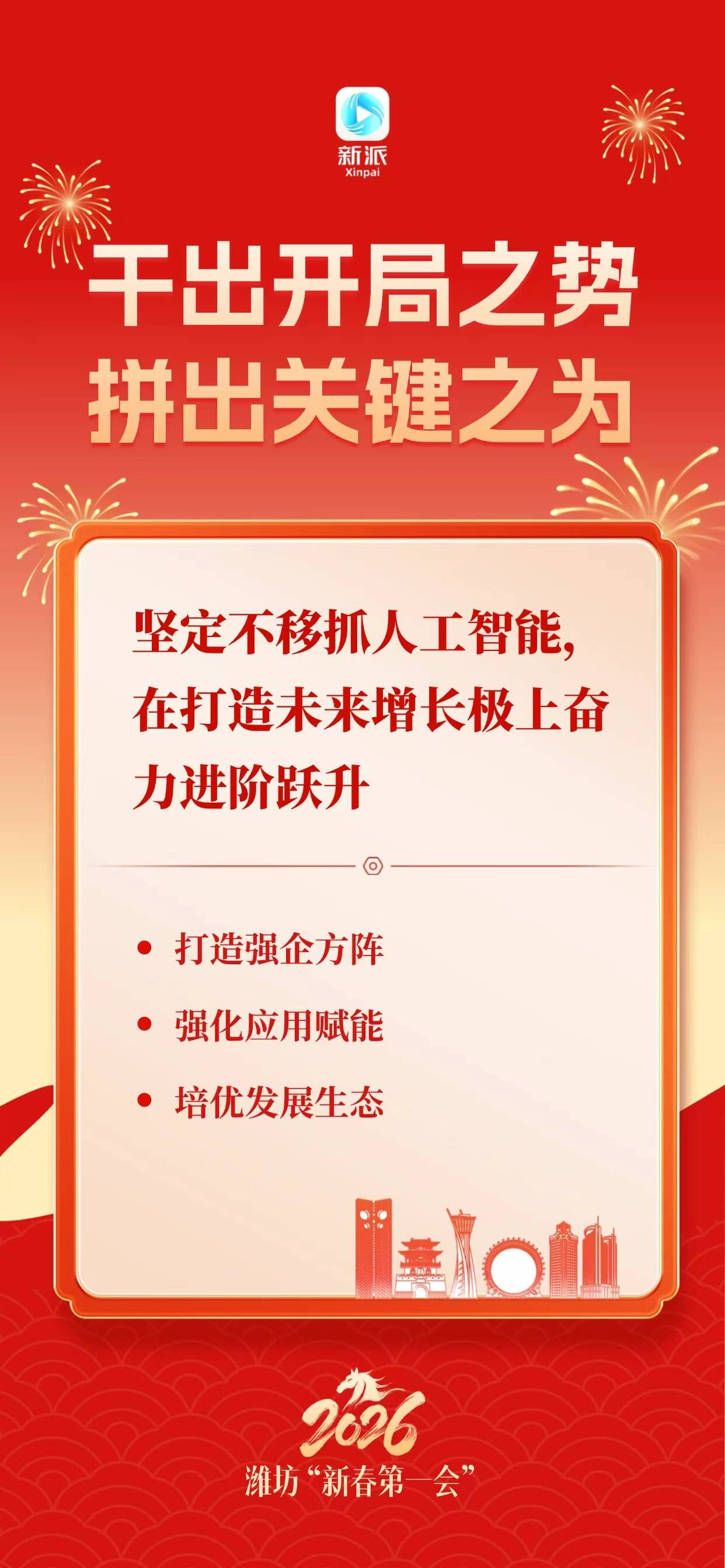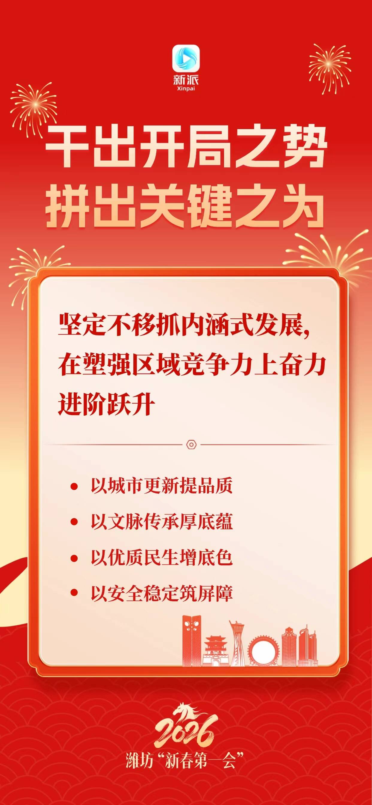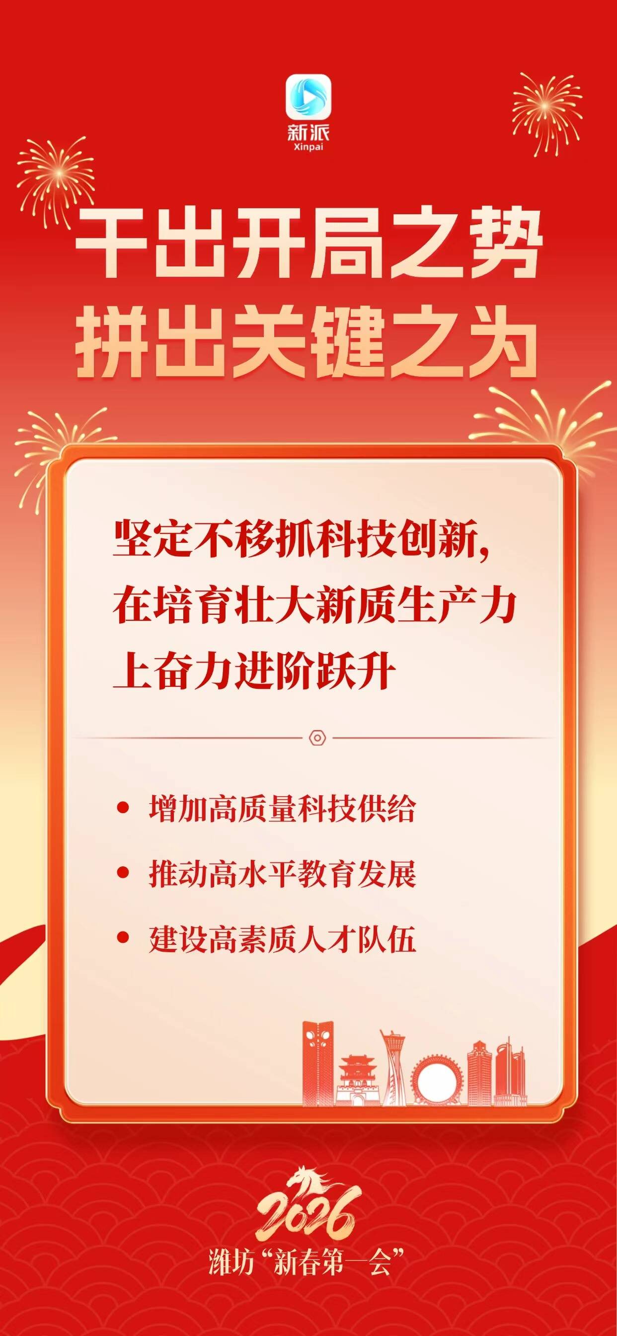 新派讯 为确保“十五五”开好局,潍坊“新春第一会”吹响奋进号角。2月25日上午,全市工作动员大会召开。会议全面贯彻党的二十大和二十届历次全会精神,深入落实习近平总书记视察山东重要讲话和重要指示批示精神,按照省委、省人民政府部署要求,动员全市上下保持昂扬斗志,铆足劲、拼力干、走在前,在开局之年干出开局之势,关键之年拼出关键之为,向着冲击万亿城、打造区域副中心城市的目标奋力迈进。