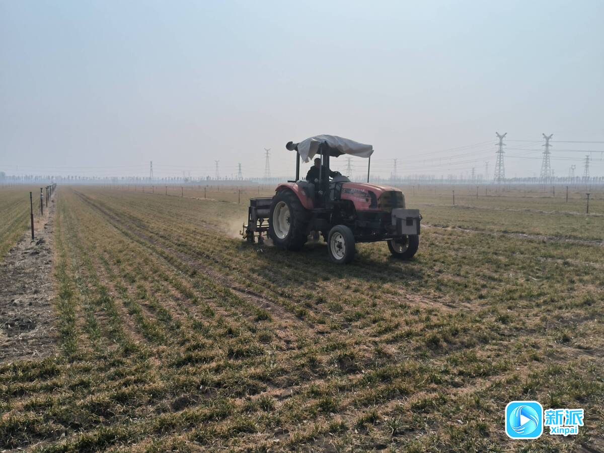 大型拖拉机在麦田里开展返青施肥作业。