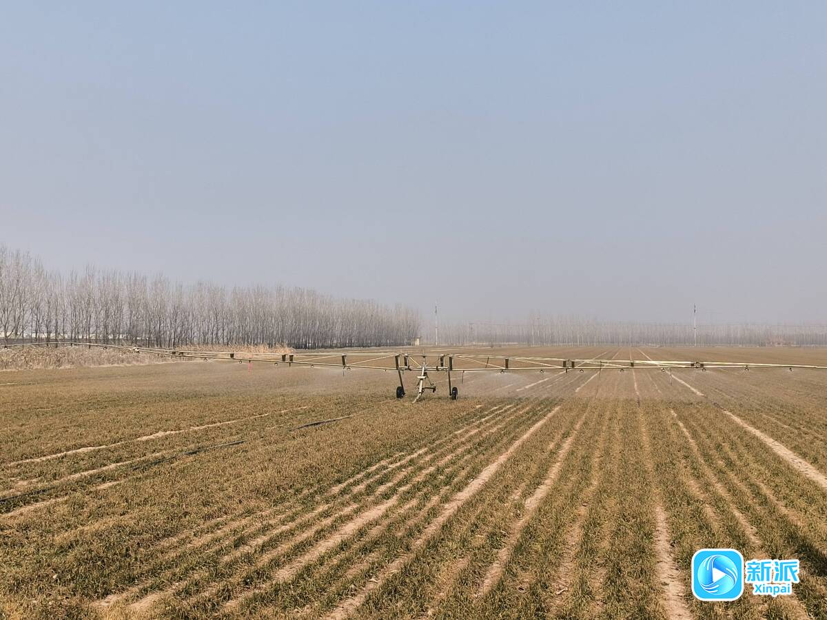 在昌邑市奎聚街道十字路土地股份有限公司的小麦大田里,智慧喷灌系统正在进行精准灌溉。
