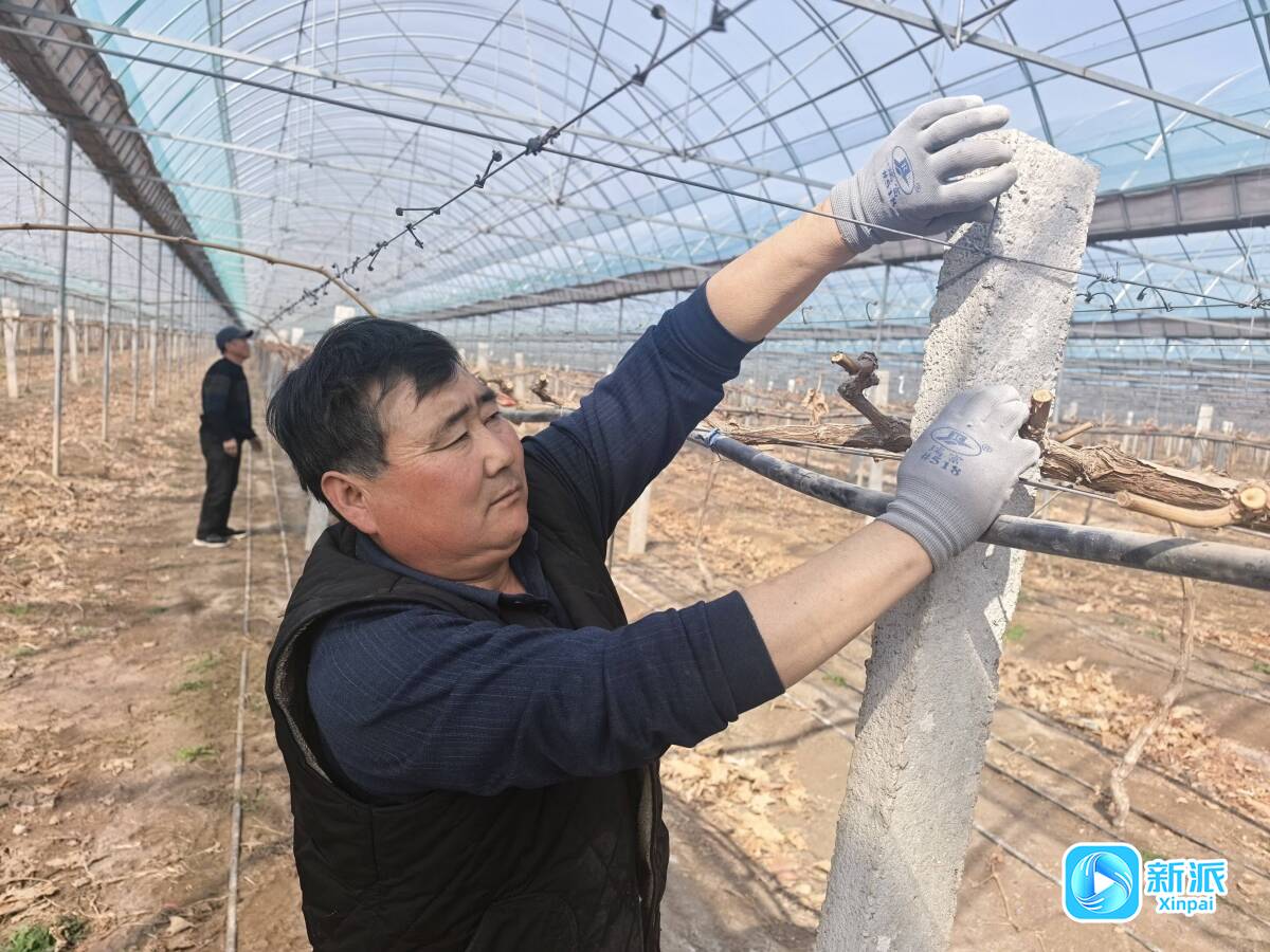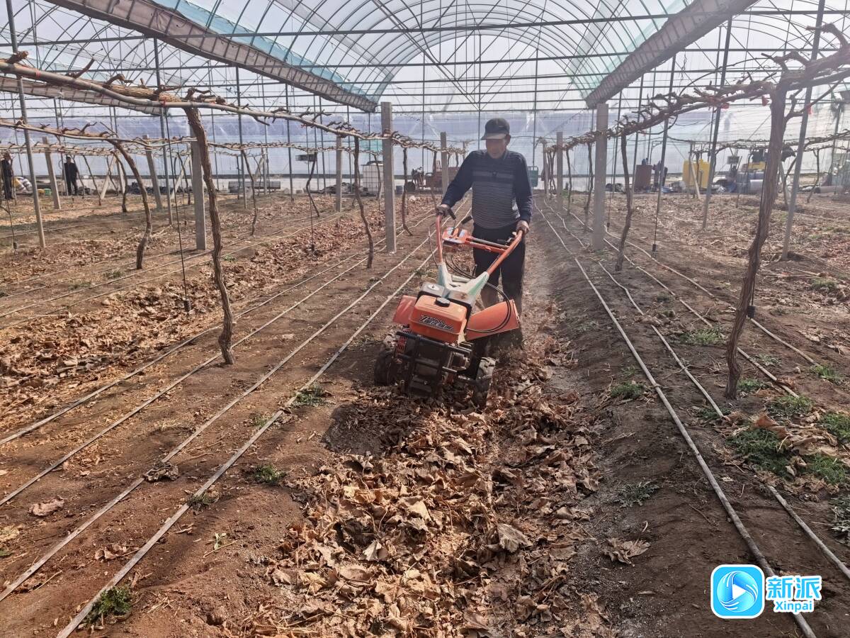 3月12日,在诸城市贾悦镇阳光葡萄种植示范园内,工作人员进行田间管理。