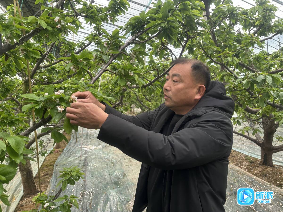 初春时节,寒亭区高里街道牟家院村高标准智能大棚里,工人们进行人工授粉。