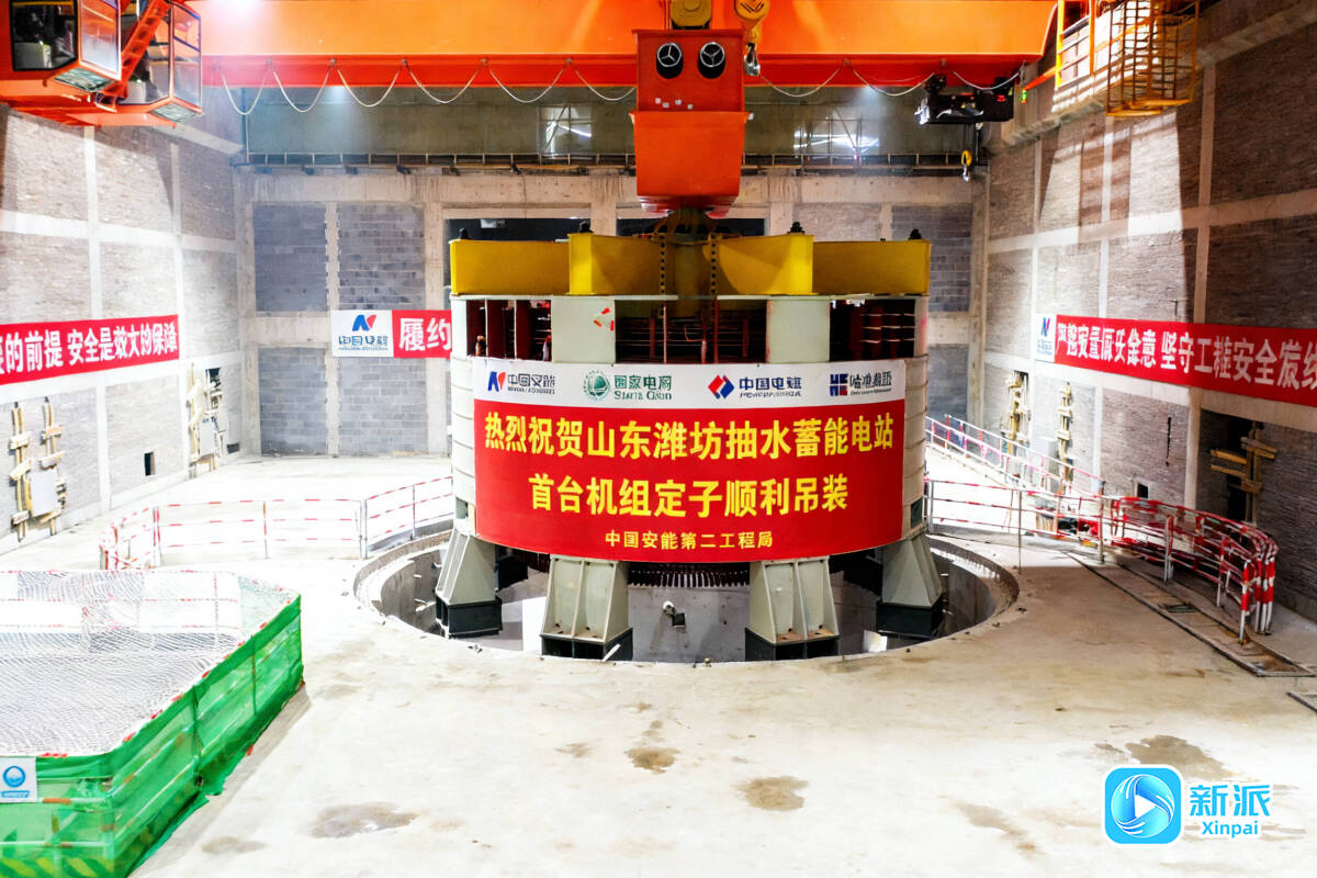 近日,在临朐嵩山山顶,国网新源山东潍坊抽水蓄能电站建设现场,重达468.2吨的首台机组发电机定子完成一次性精准就位,为首台机组按期投产发电奠定了基础。